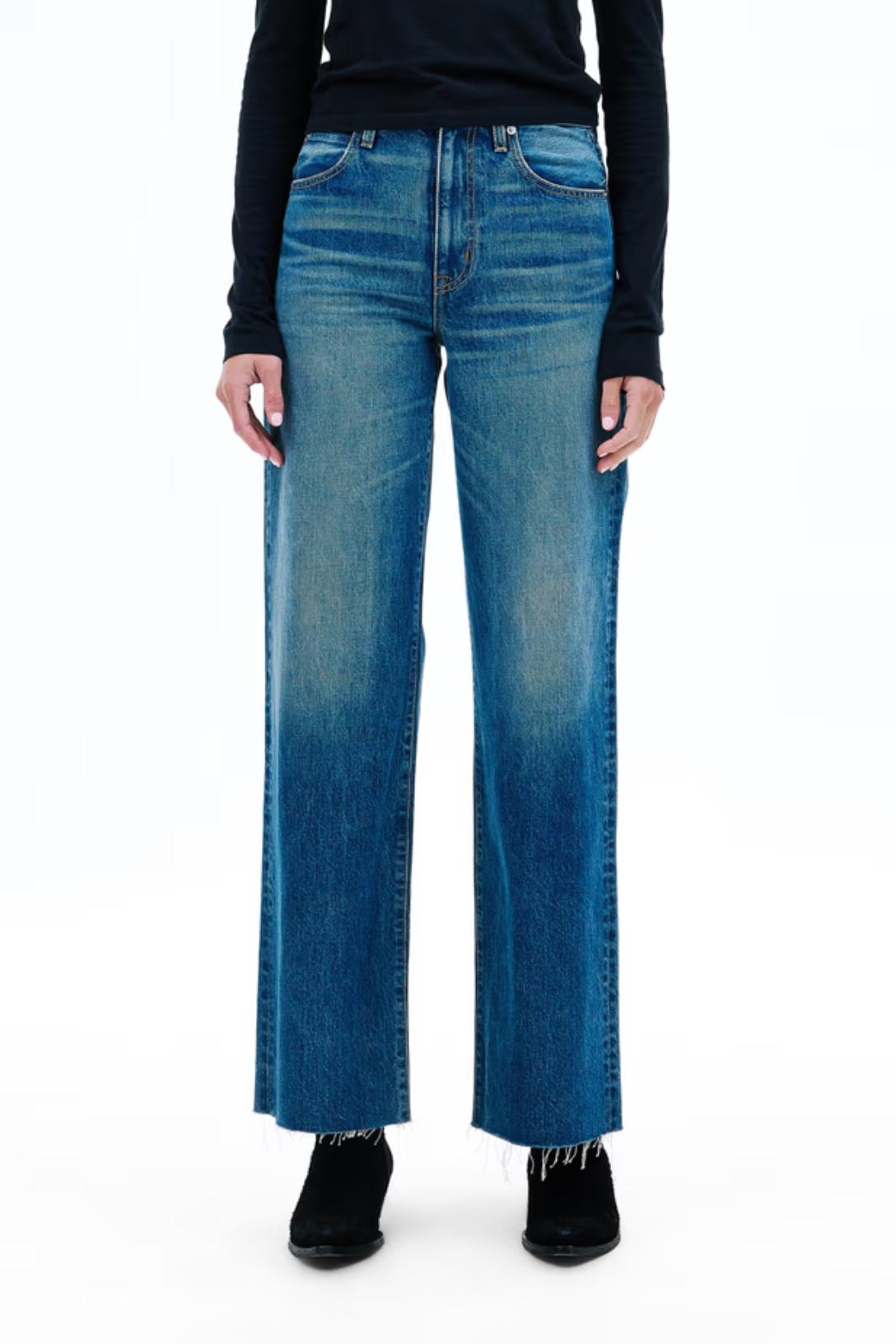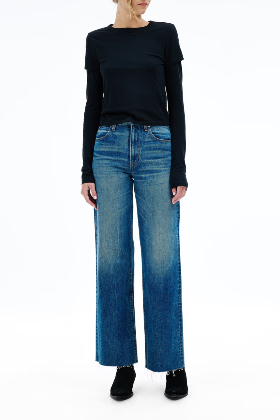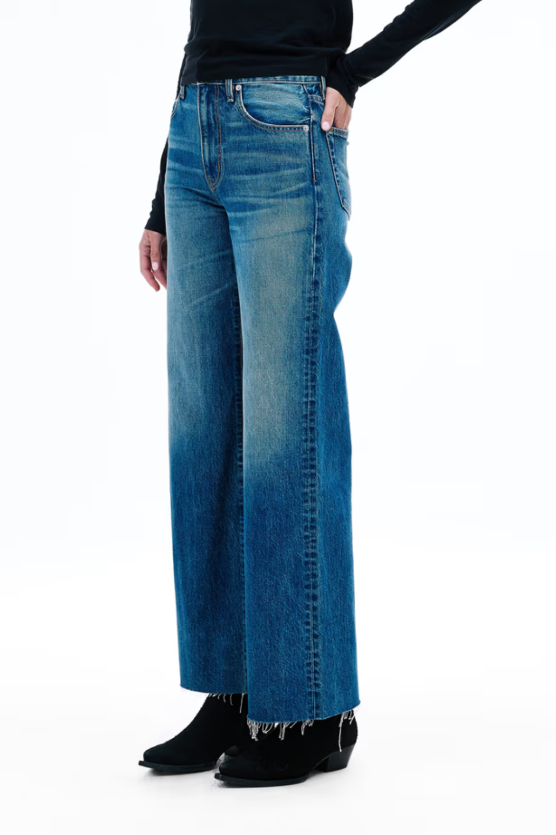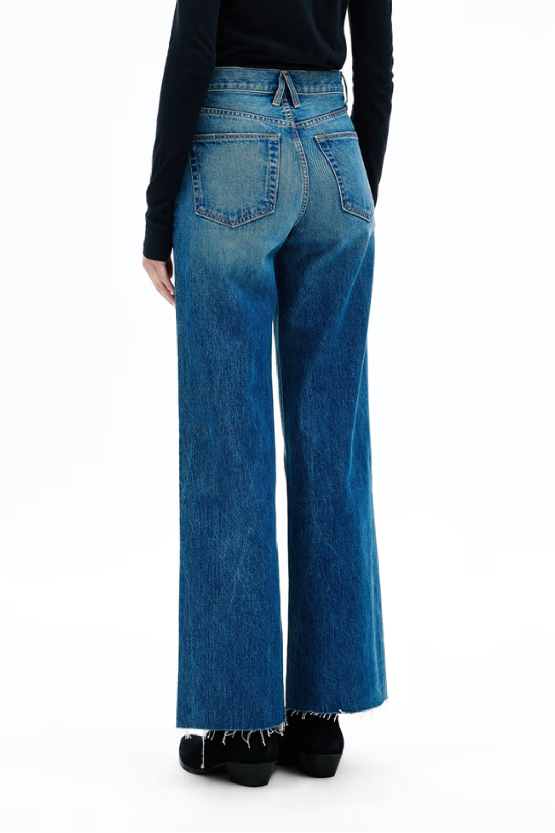 Grace is a signature style designed to elongate the leg with a high-rise waist and a playful wide-leg silhouette. The Sycamore Grove wash is made from regenerative cotton and features a classic dark stone wash with subtle hand-detailed whiskering and a raw hem that will naturally fray over time, creating the perfect vintage, worn-in look.