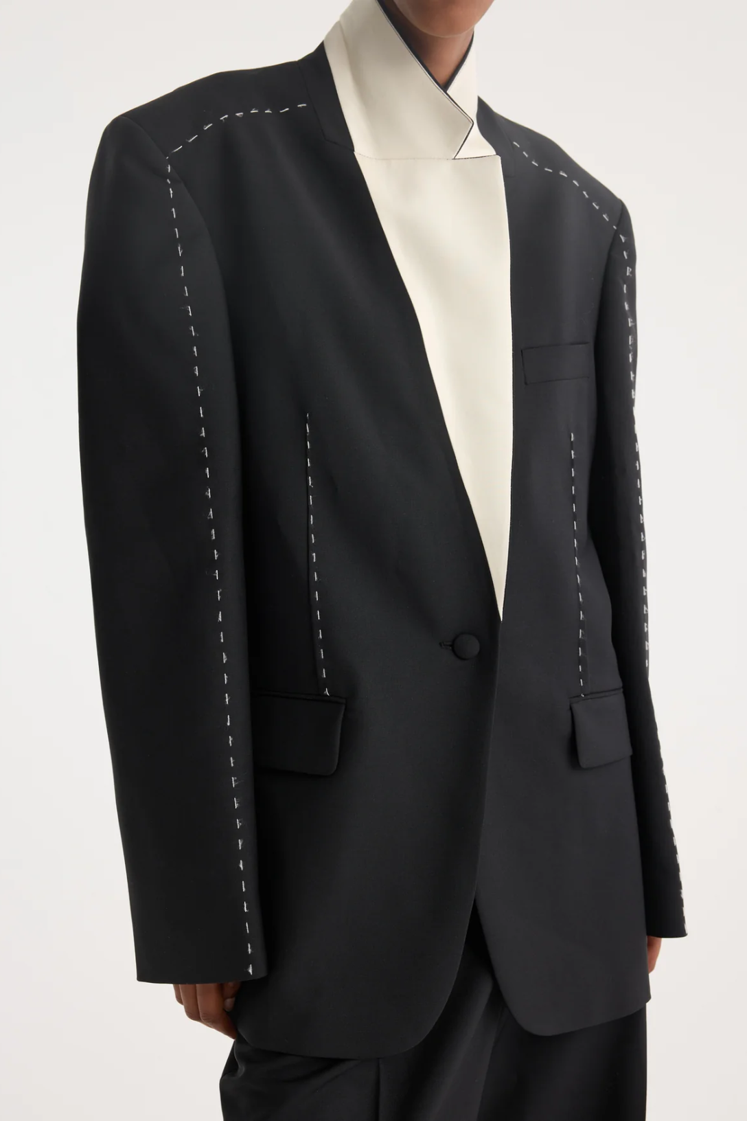 A modern classic with a graphic edge, an oversized blazer framed by contrast stitching that follows the silhouette. Turn up the lapel to reveal a white underside for a sharp monochrome statement. Crafted from a soft virgin wool and mohair blend, woven by a renowned Italian mill specializing in premium tailoring fabrics, this lightweight wool-mohair blend is designed for structure, breathability, and lasting performance. Made with mulesing-free wool, it reflects Róhe's commitment to responsible sourcing.