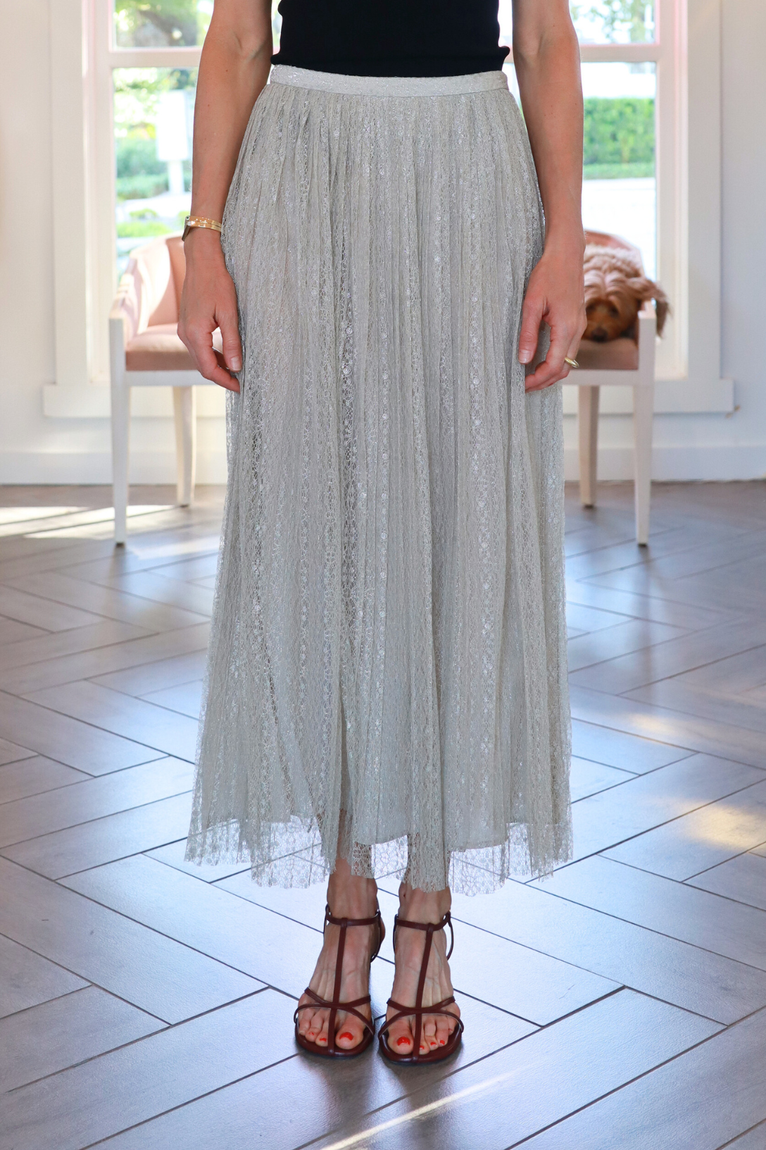 Defined by ethereal elegance, the Maren Skirt is crafted from featherlight, metallic lace from Italy and is adorned at the hem with scalloped eyelash trims. This pearly silver skirt is fixed at the waist and unfurls into a pleated silhouette that moves with graceful volume. It has a lining and fastens with a concealed side zipper.