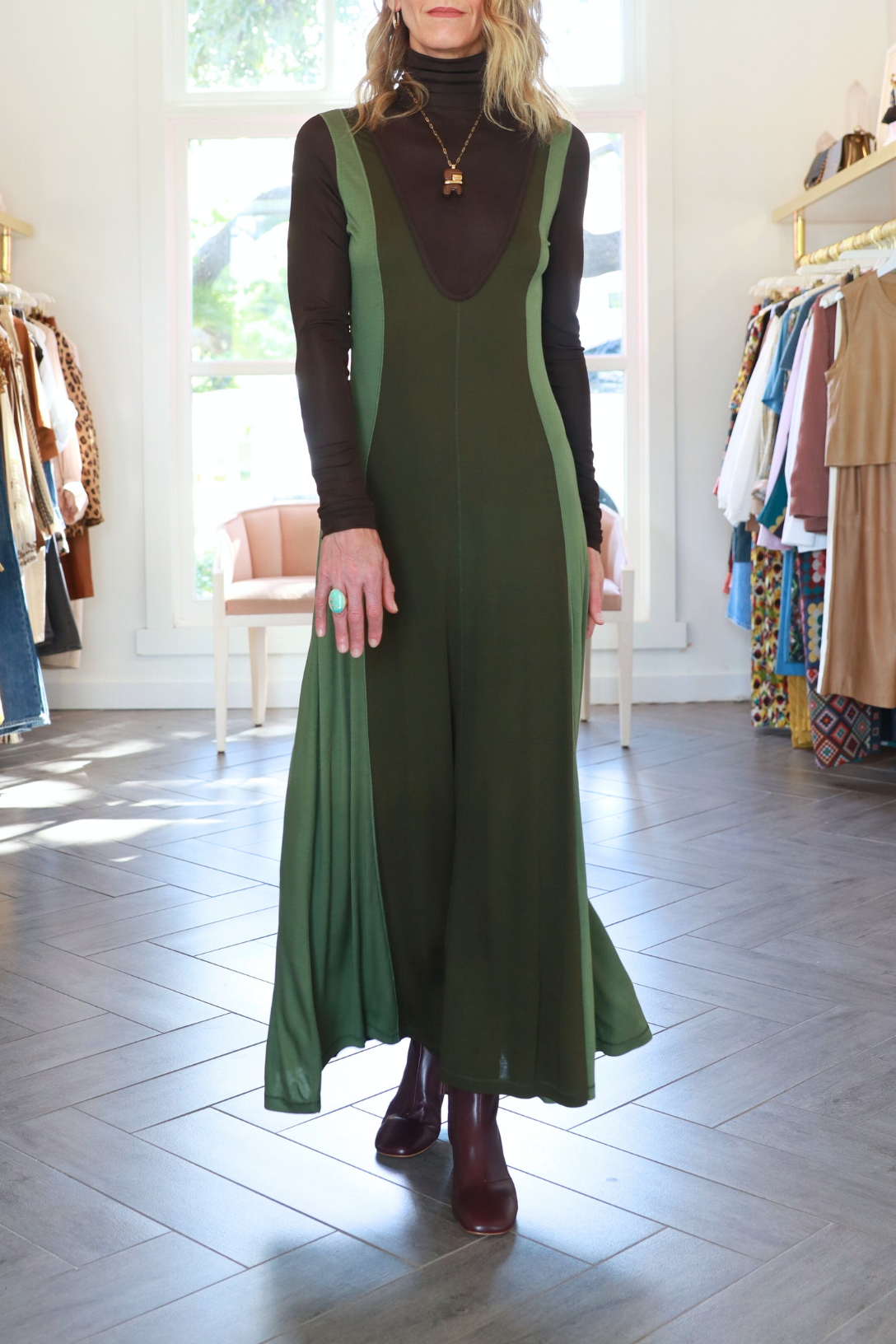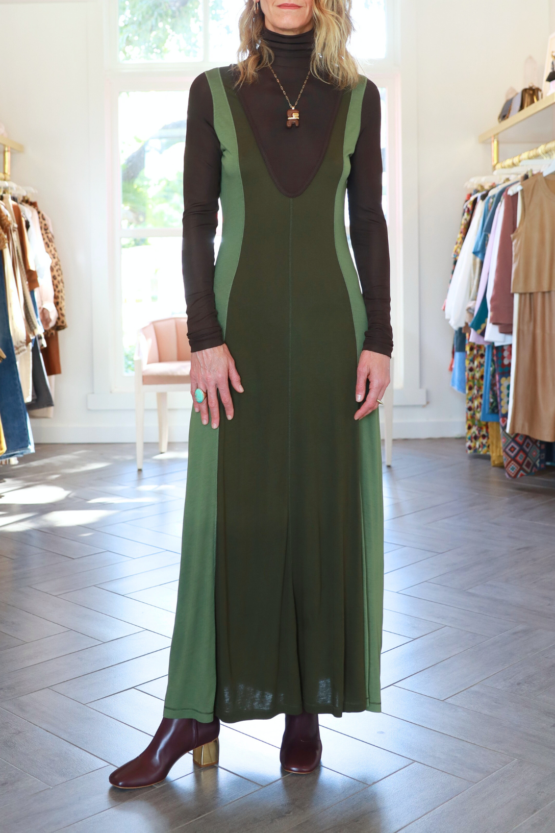 Debuting in Look 49 on the AW25 runway, the Nahla Dress features a sleek silhouette with a collage of textures in smooth and ribbed jersey. This surface-rich, dark green dress is patchworked to create the illusion of a V-neckline and is finished with sportif cover stitching.