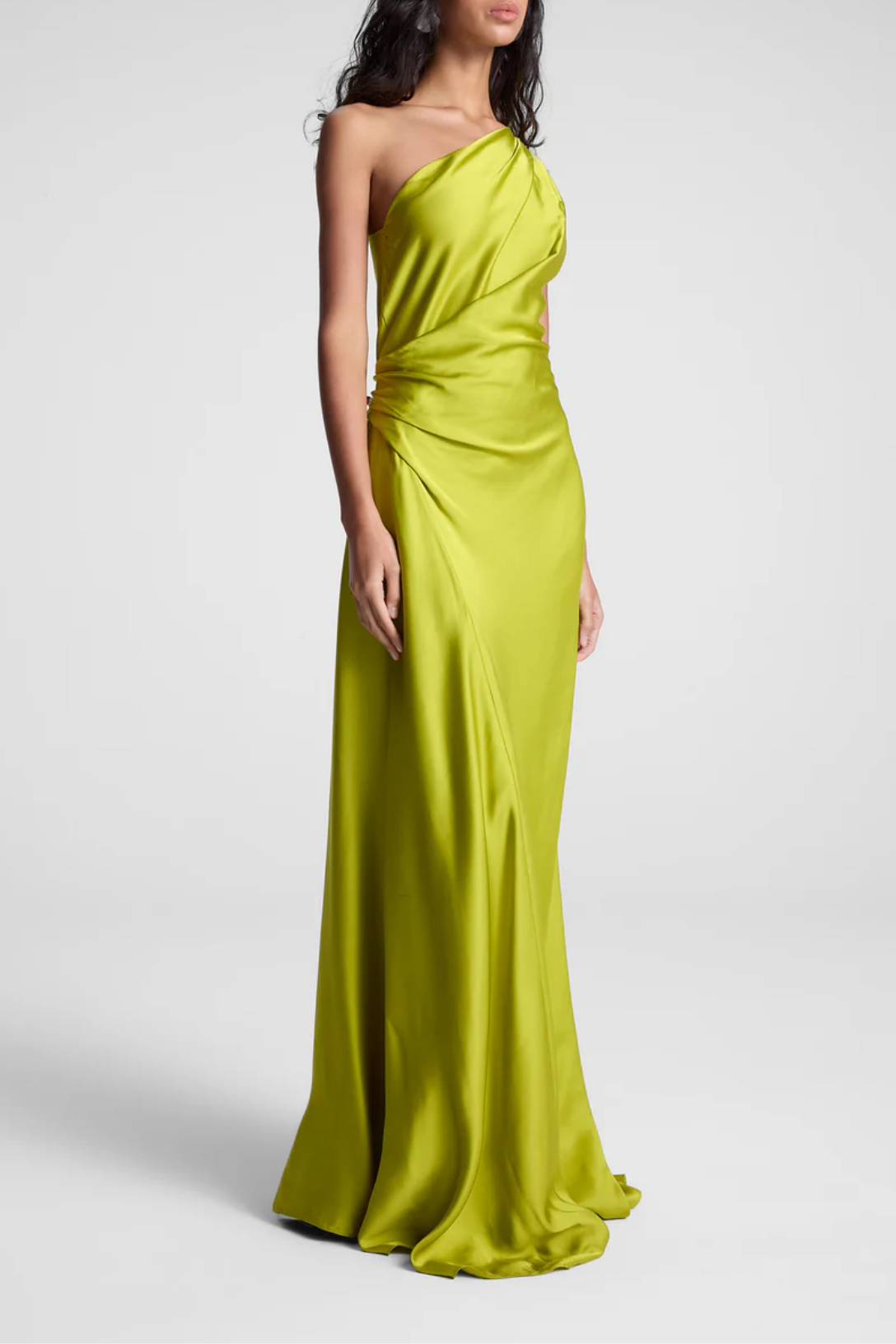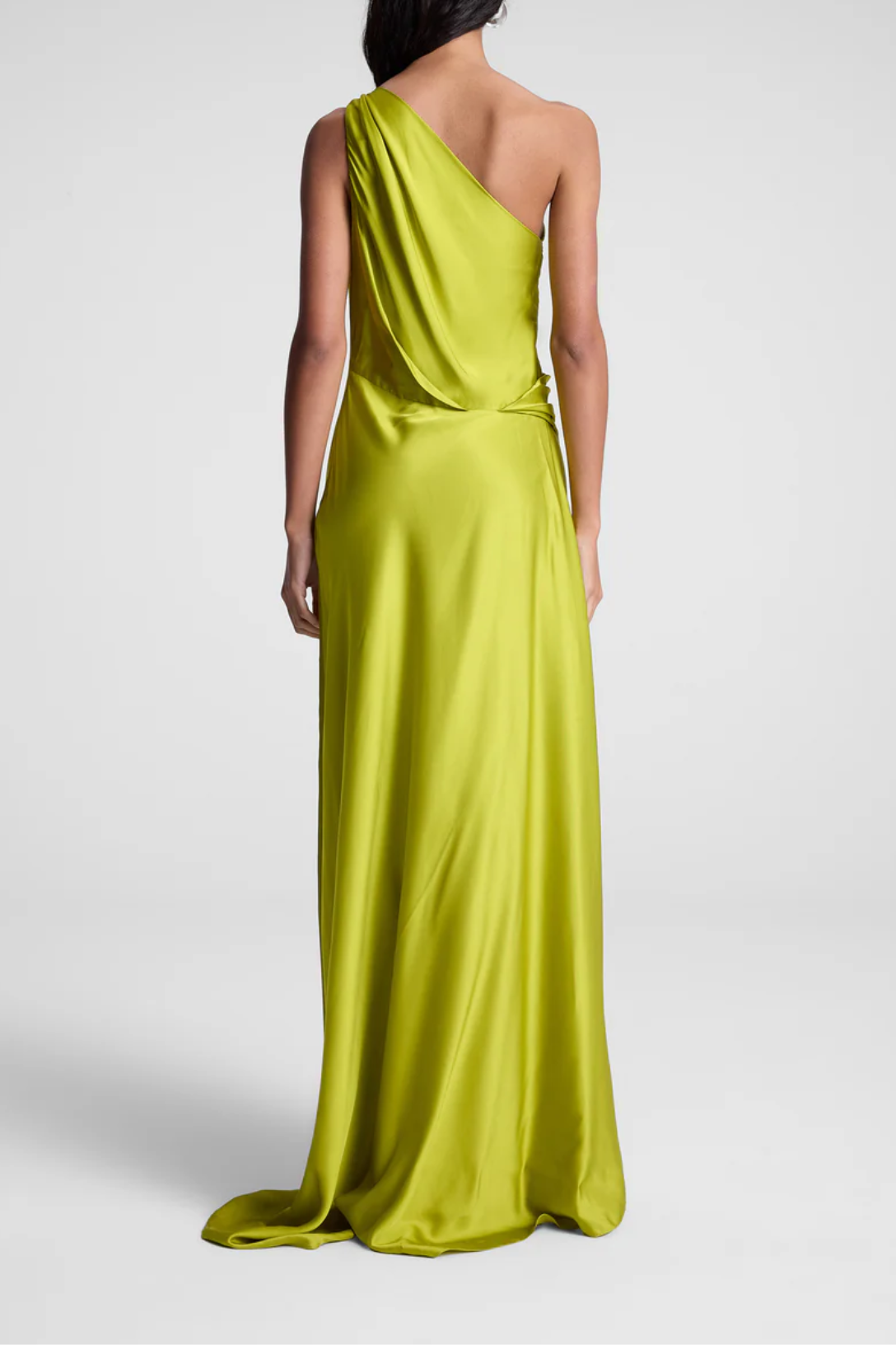 The Aster Gown is crafted from fluid satin fabric in a luminous chartreuse hue. This one-shoulder silhouette drapes effortlessly across the body, featuring soft pleating at the shoulder and waist for a sculptural effect. The open-back design enhances its fluidity, creating an elegant yet striking profile.
