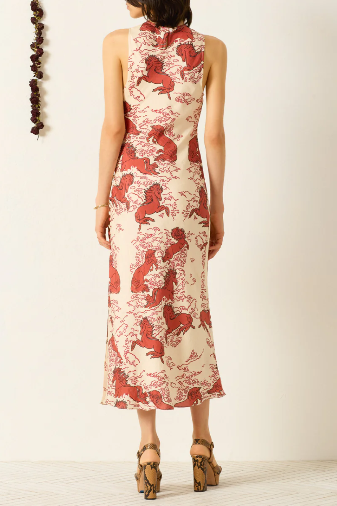 Rendered in hand-loomed silk, Alix of Bohemia's bias-cut slip dress has a crew neckline and a slit hem trimmed with decorative silk-covered buttons. Fully lined, the figure-skimming number features a mythical horse motif.