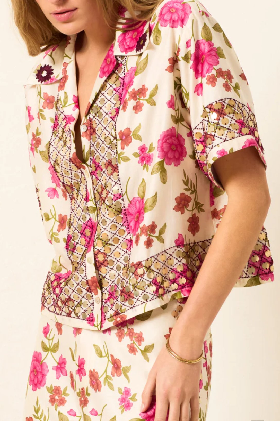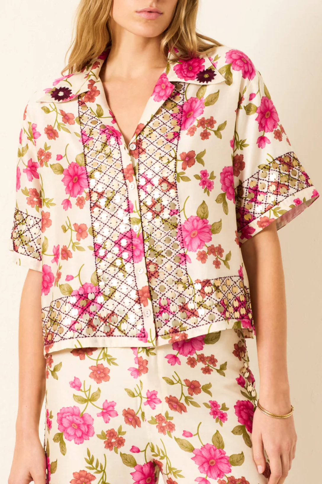 Inspired by a vintage Hawaiian shirt, the slightly cropped silhouette has an open collar and boxy fit. The cotton-silk blend floral shirt is hand-embellished with silver metal coins.