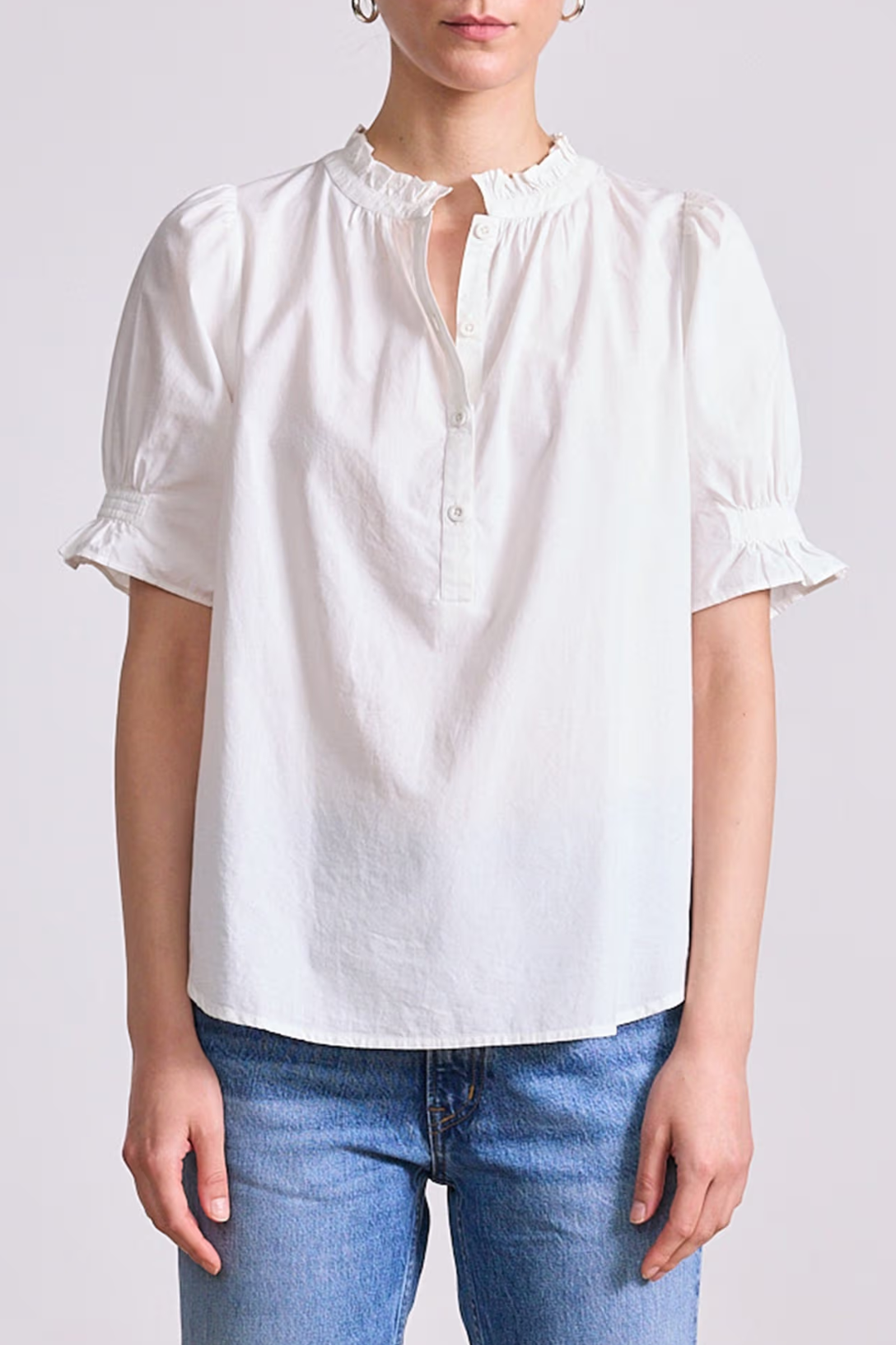 • Button closure, ruffled neckline, straight silhouette, high-low hem, short puff sleeves