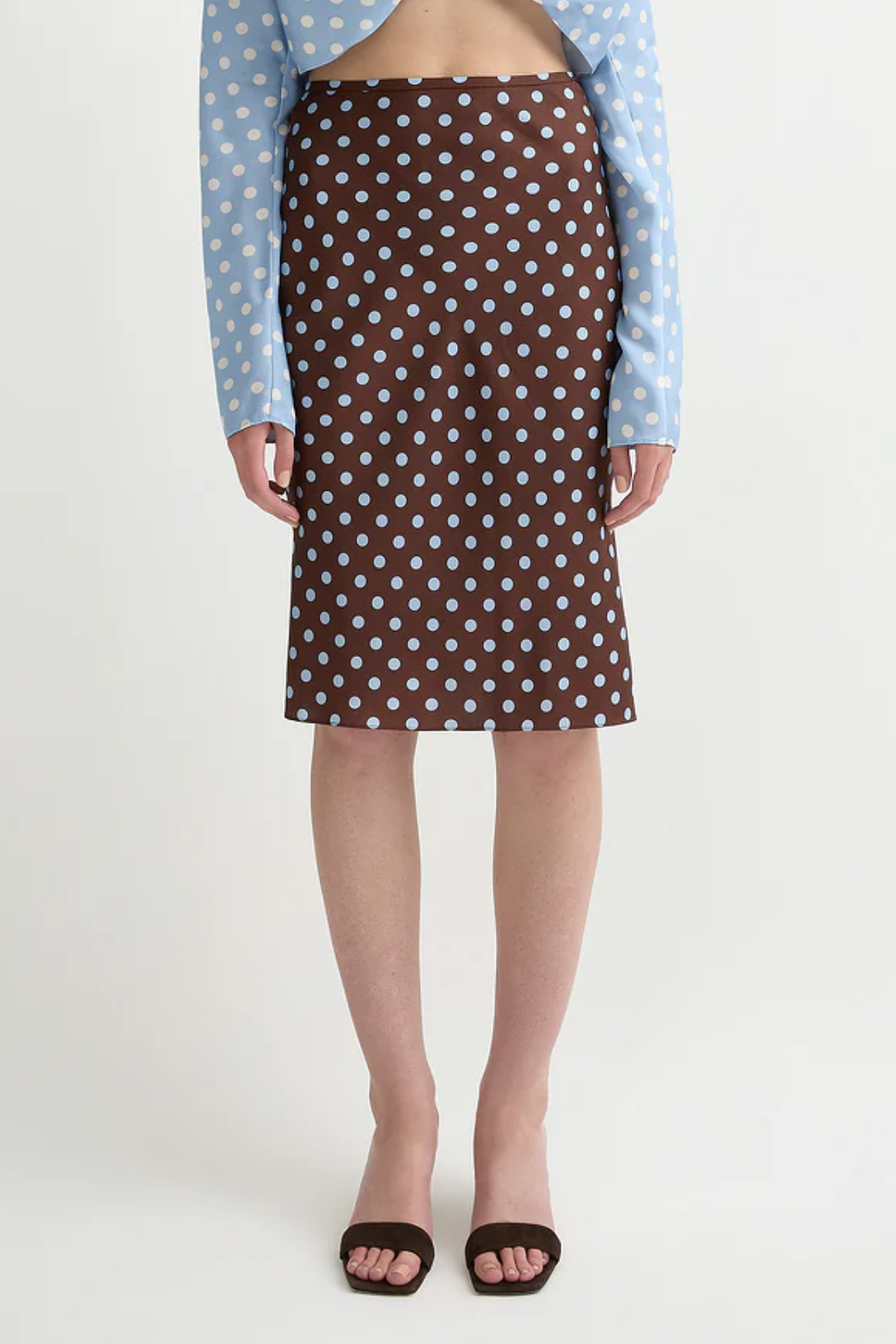 The Leo Skirt is crafted from a soft, drapey Tencel in a signature polka dot print. Designed with a bias cut and bind detailing at the waist, it falls just below the knee.