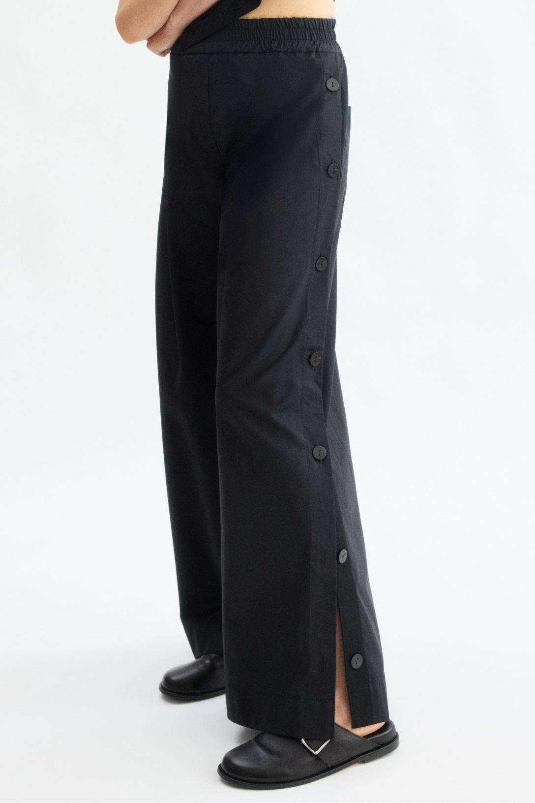 Wide leg pants with a side seam button placket and grosgrain trim.