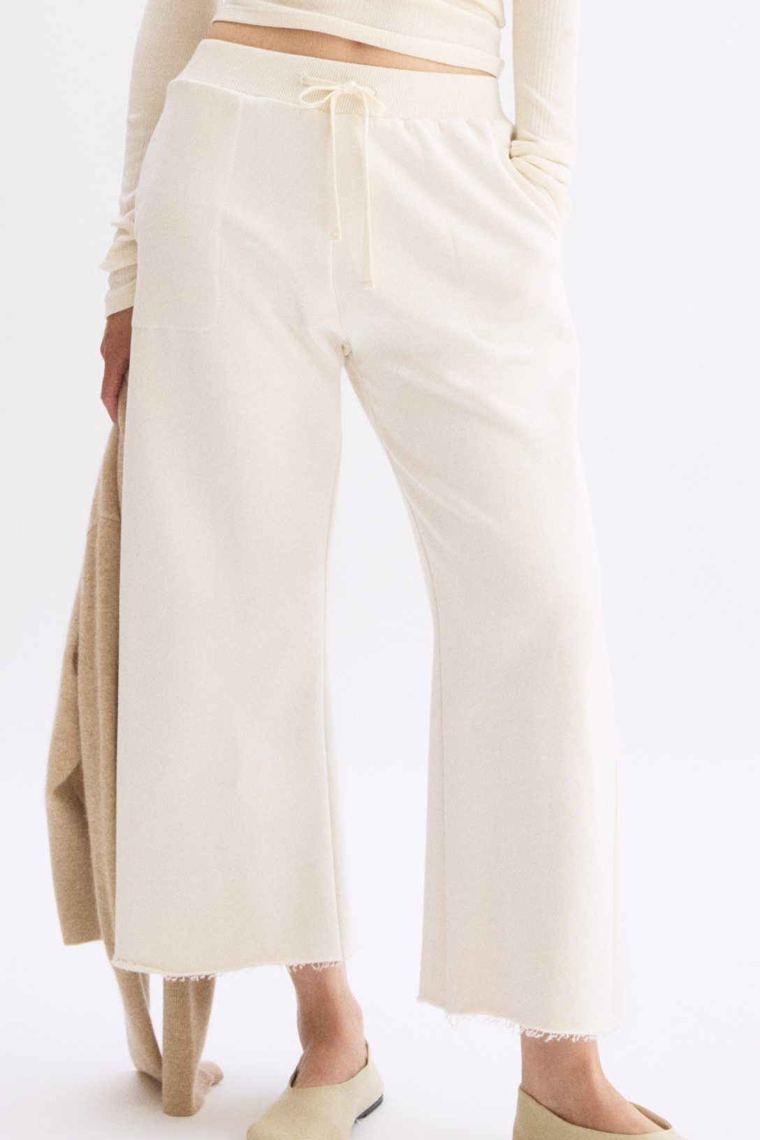 Arlo Mott's wide leg sweatpants with a raw hem.