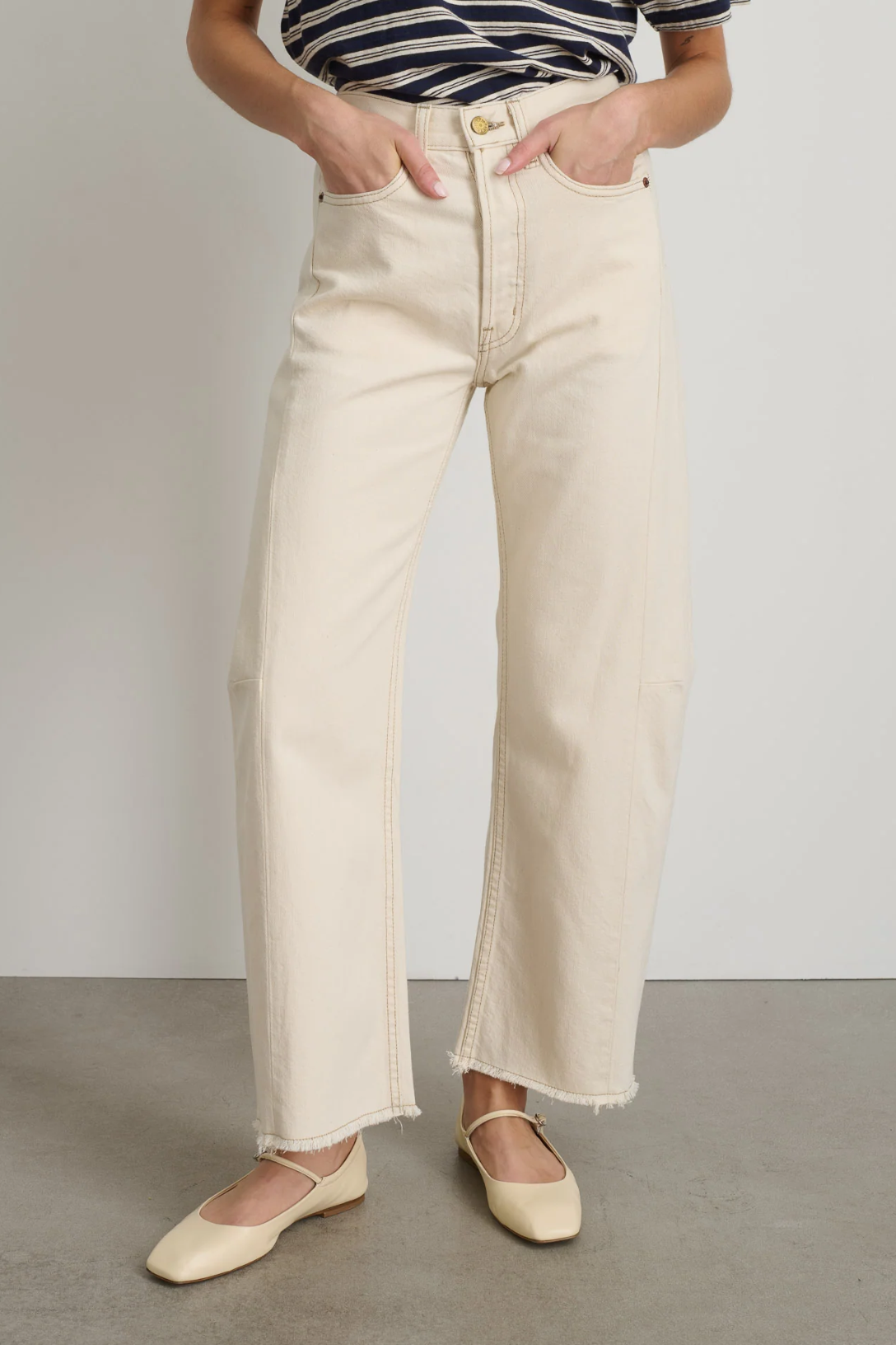 - High rise fit sitting at the natural waist with a cropped 29" inseam. Relaxed fit through the hips with an articulated slim bowed leg shape