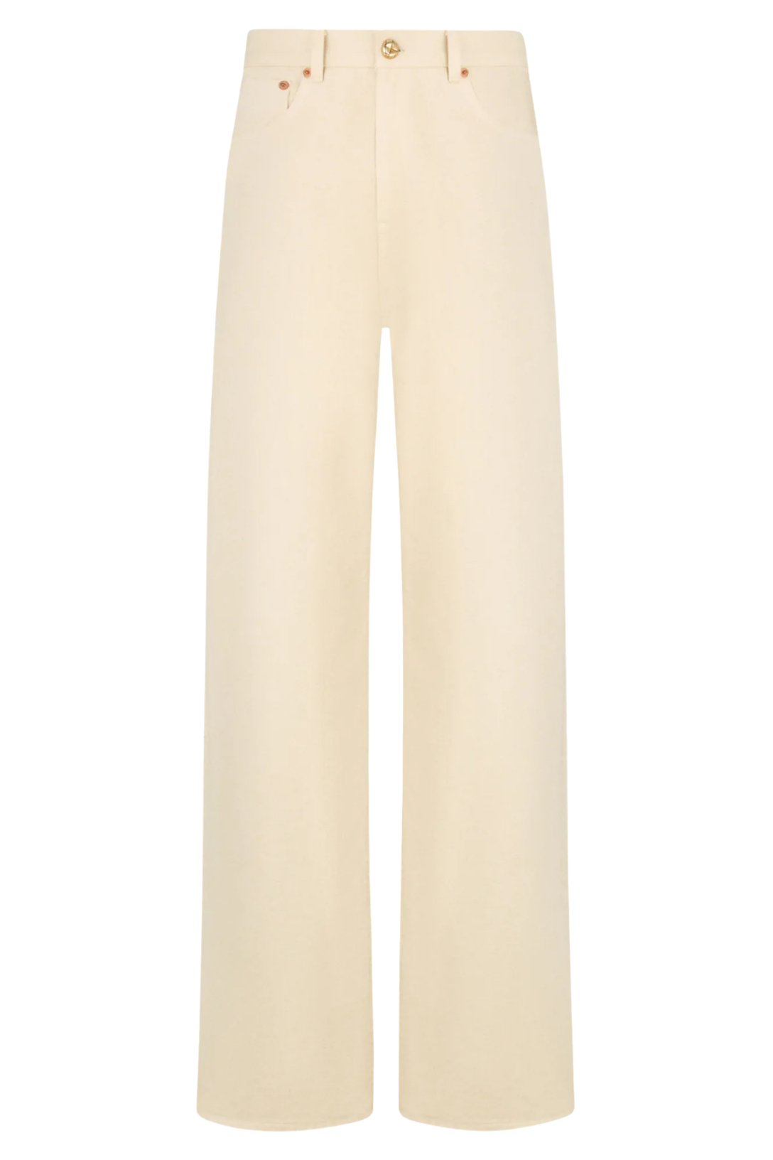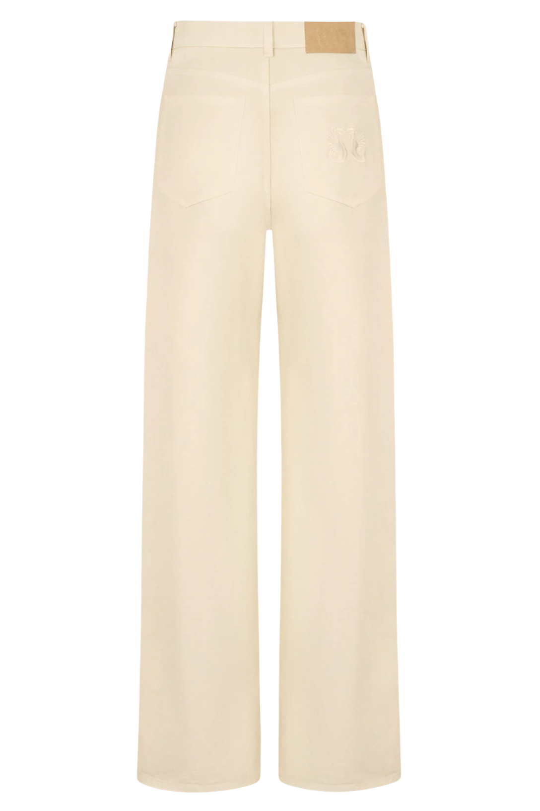 The Nariida Almond Java Jeans are cut in a relaxed, wide-leg silhouette with a subtle flare. Made from pure cotton denim in a soft almond off-white hue, they feature the brands signature Smiley design stitched on the back pockets for a distinctive finish.
