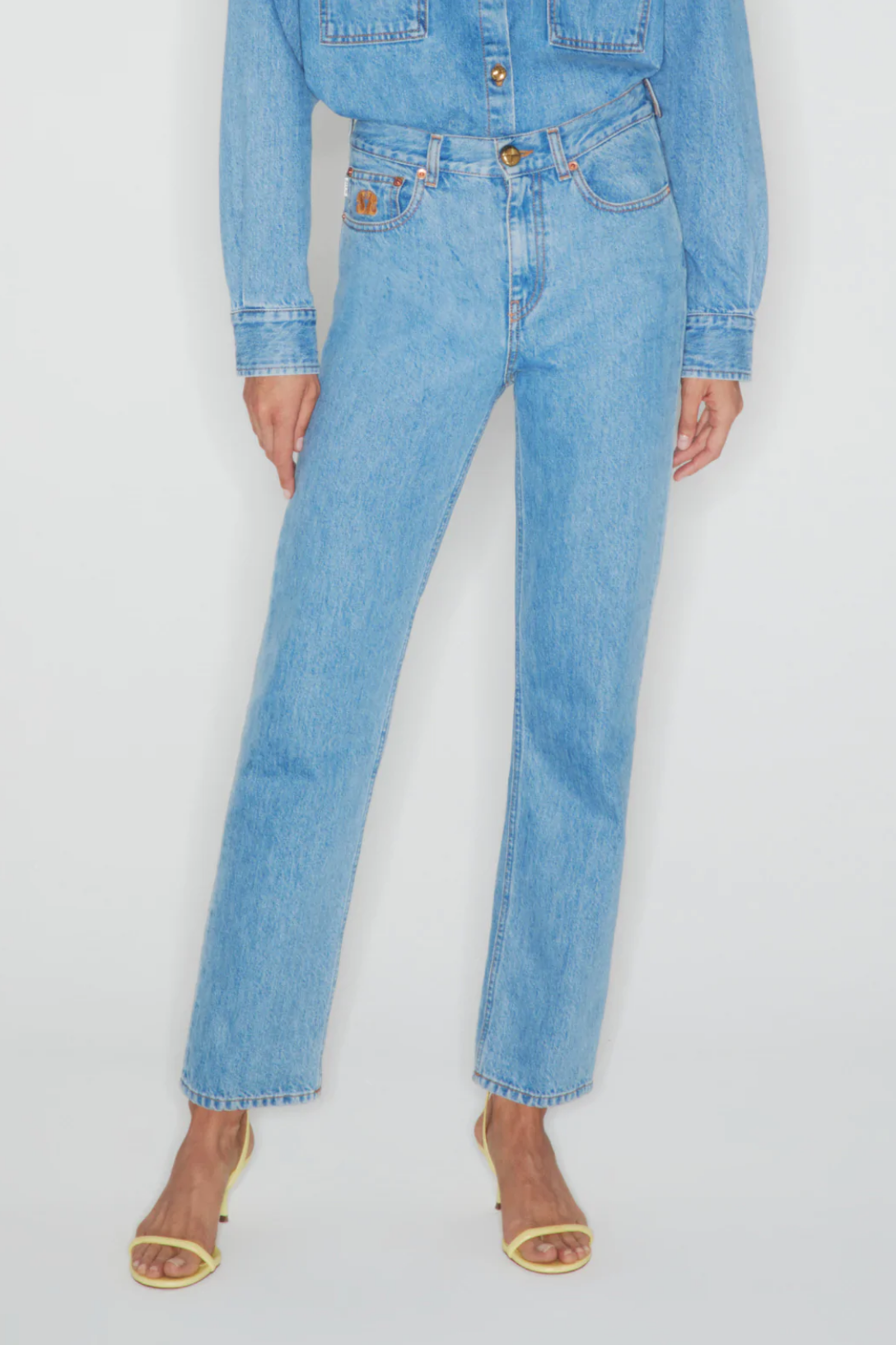Discover the pleasure of sartorial jeans. BLAZÉ Milano employed its signature tailoring expertise to craft impeccably cut jeans. Showing a bootcut silhouette and a high waist, these timeless denim pants reveal two back pockets stitched with the brand's iconic smiley design, making them immediately recognizable.