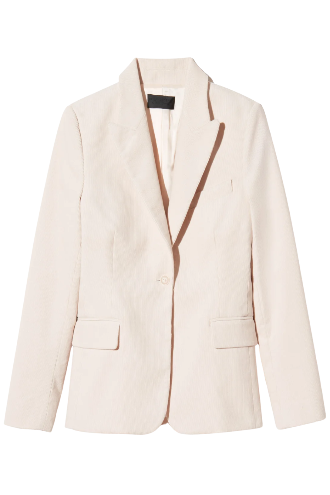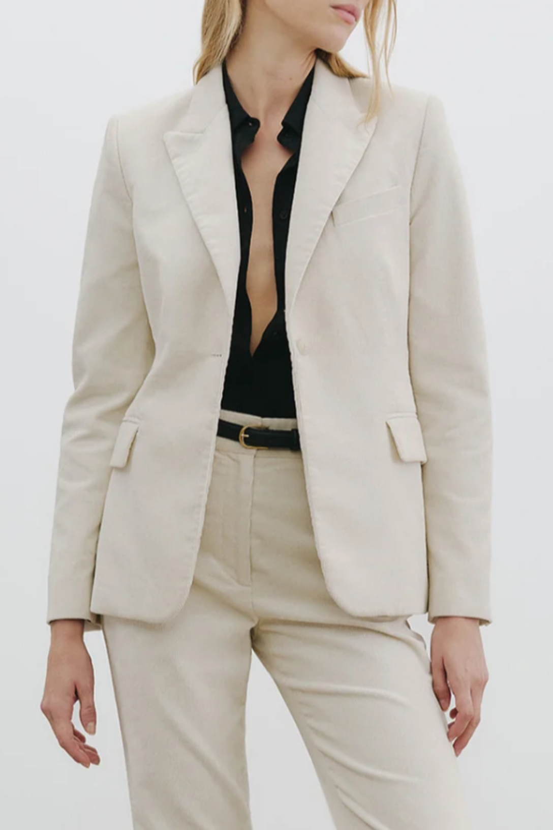 Fitted single-breasted jacket in cotton corduroy. Exaggerated lapel. Darts at front for shape. Structured shoulders with shoulder pads. Chest welt pocket and front flap pockets. Five buttons at sleeves. Back vent. Fully lined with interior chest pockets.
