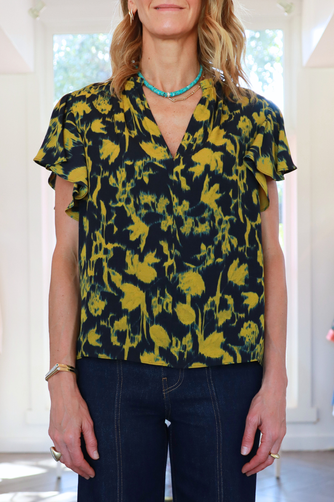 The Lilo Blouse is cut from signature satin-back crepe adored for its silken underside. Framed by fluttering sleeves, this top is richly adorned with surreal ikat botanicals that are brushed and diffused across the surface.