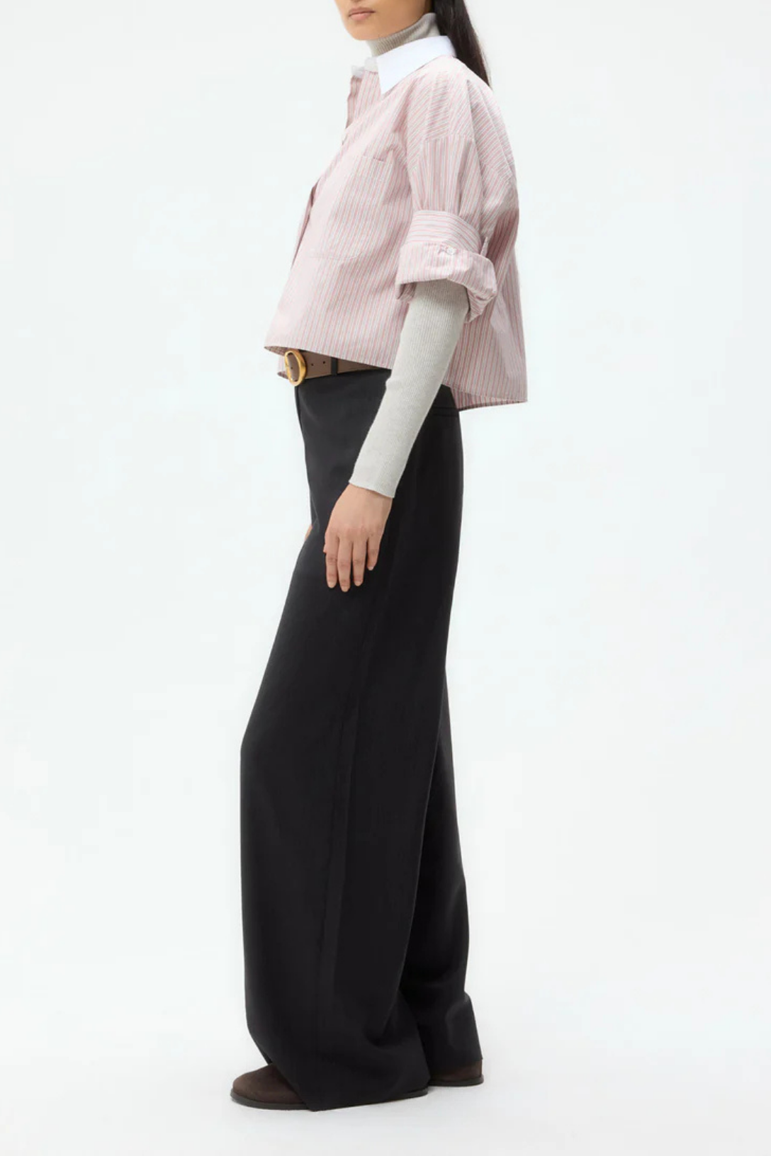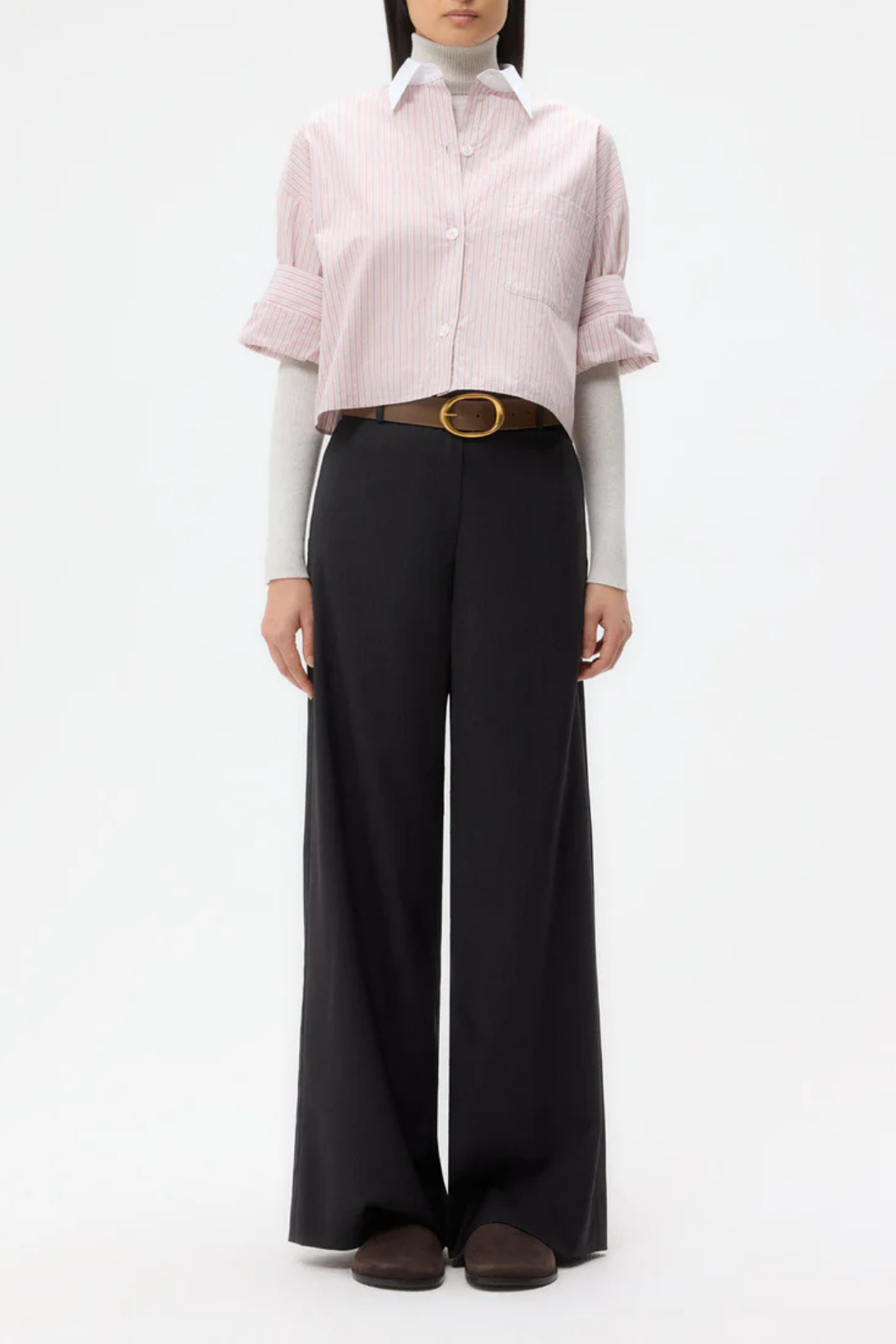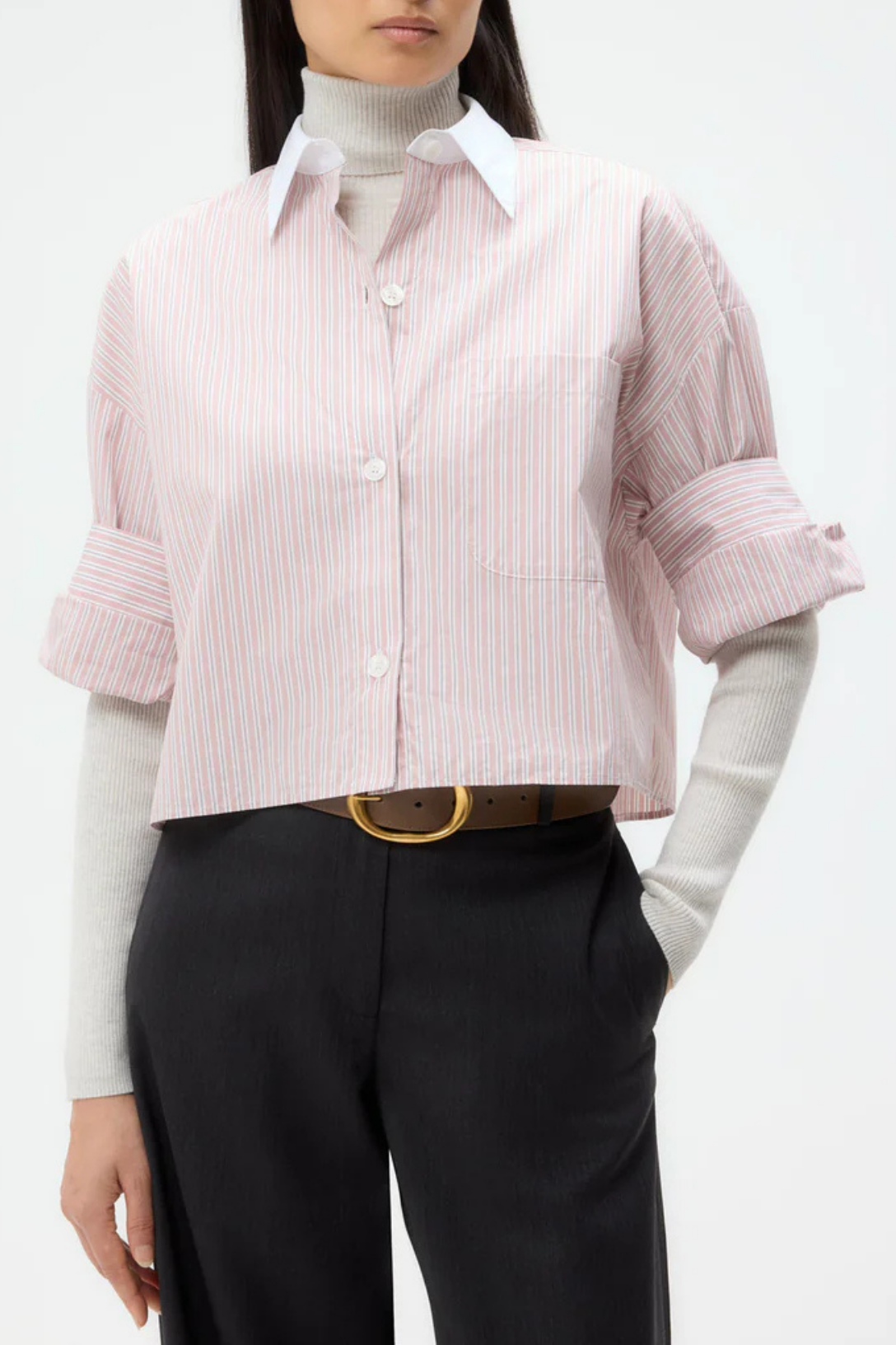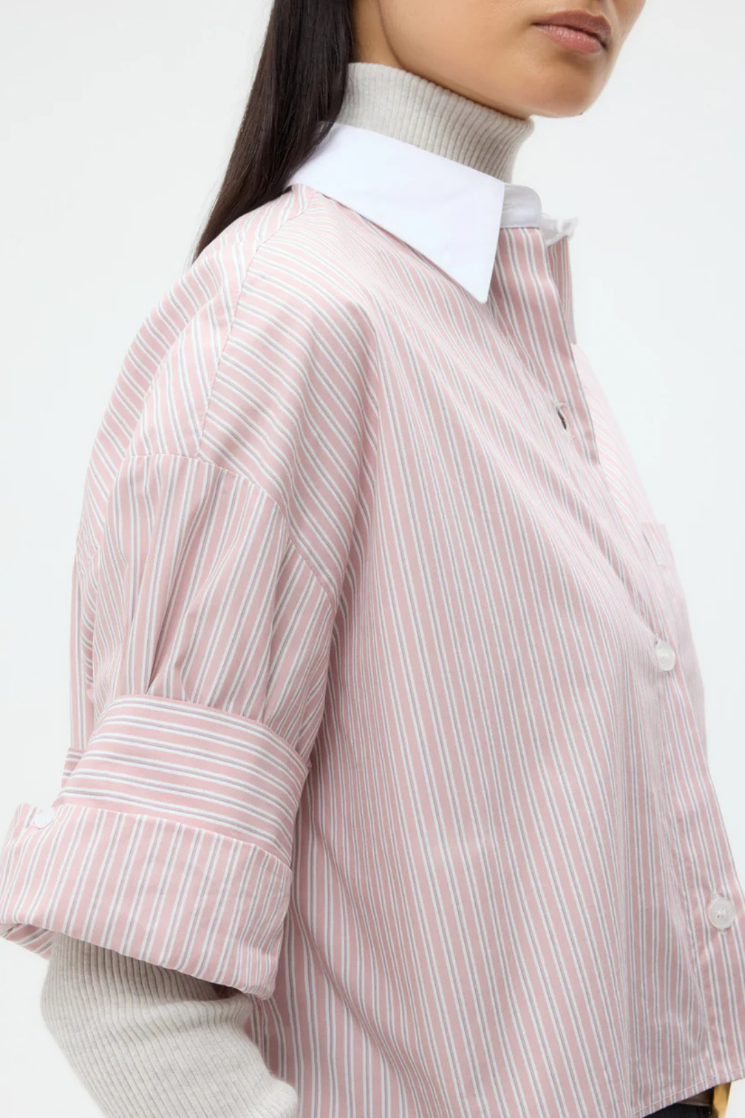 Cropped, short sleeved button down in striped superfine italian cotton shirting. The Next Ex is a boxy silhouette. Complete with a chest patch pocket, button up placket, spread collar, and signature double roll button cuffs.