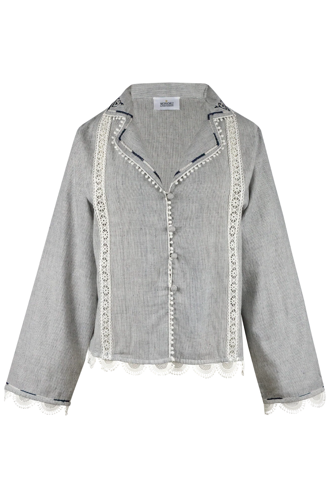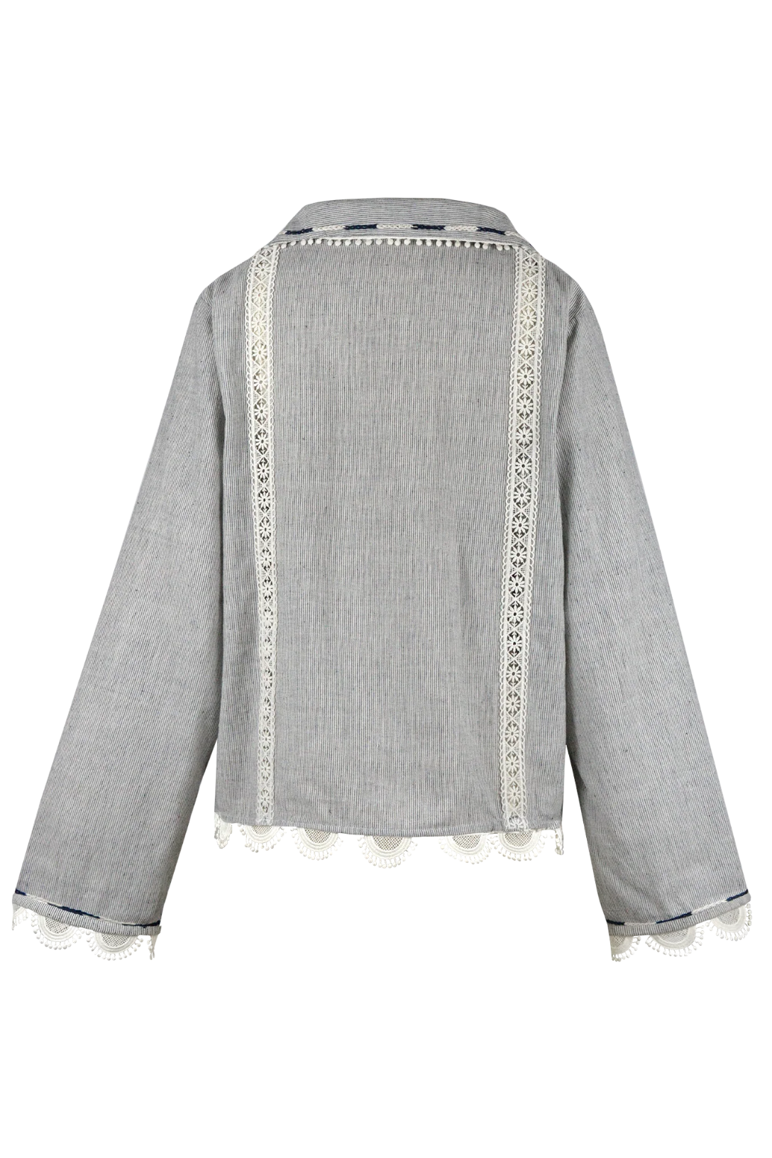 Crafted from soft, breathable cotton, the Rita Shirt features delicate white embroidered accents on the collar and sleeves, adding a touch of elegance to its crisp silhouette. Lace detailing runs gracefully along the front, creating a feminine contrast against the structured stripes.
