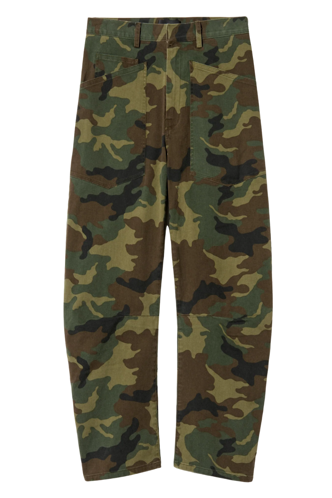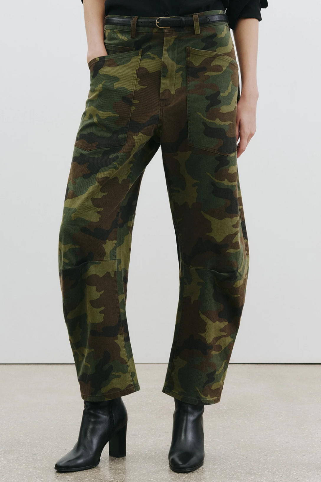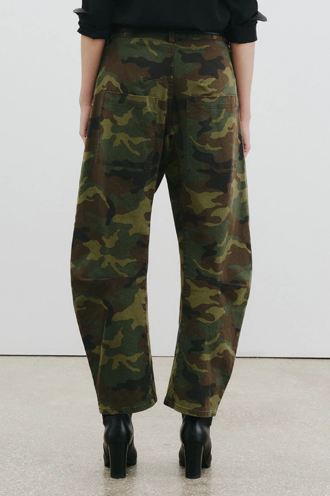 Mid-rise, relaxed fit barrel leg pant. Uniquely curved silhouette. Seam detail at knees. Gusset at inseam. Zip fly. Hidden hook-and-bar closure. Hidden stay button closure. Top-stitched front and back patch pockets. Belt loops.