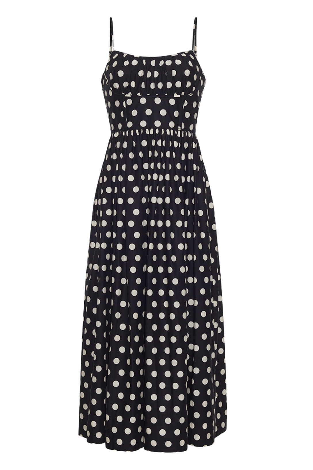 Midi length fit-and-flare with adjustable spaghetti straps and ruched bodice.