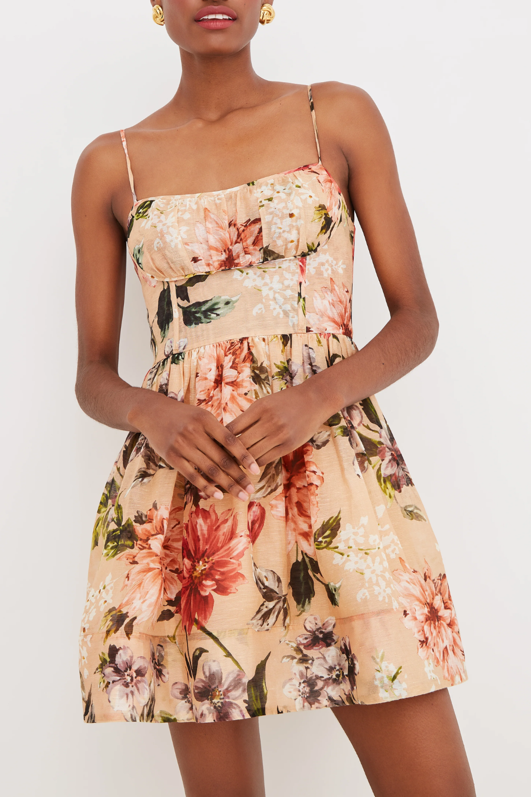 Mini length fit-and-flare dress with spaghetti straps and ruched bodice.