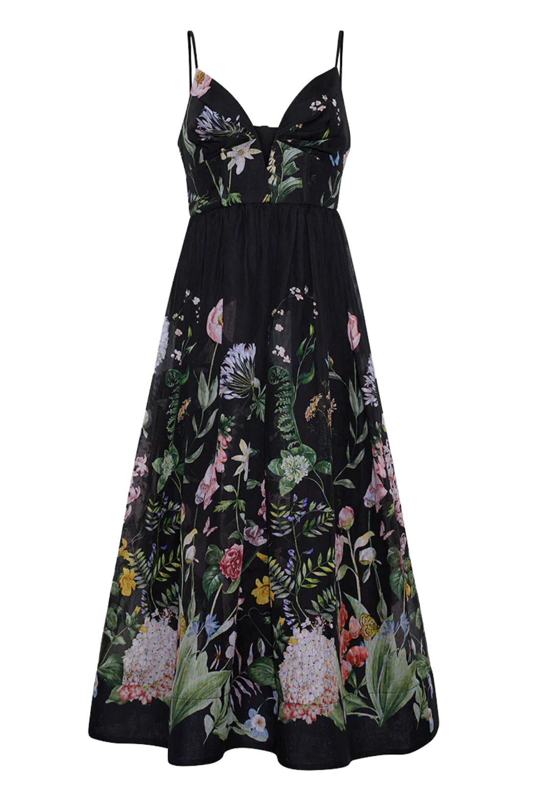 Sleeveless fit-and-flare midi dress with plunging v-shaped neckline.