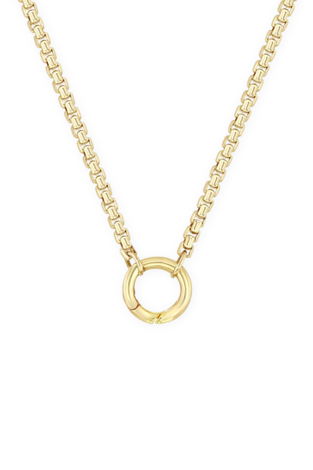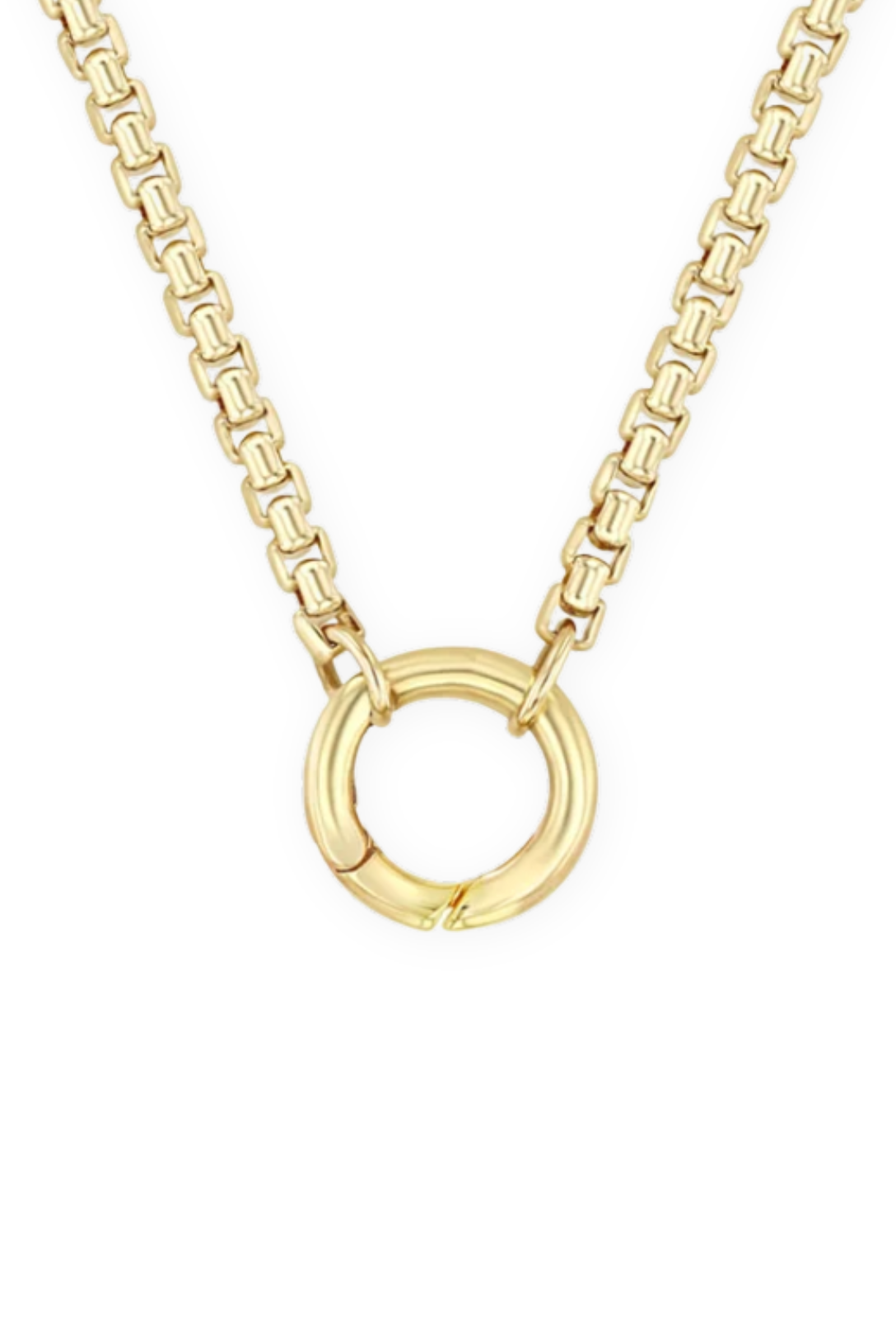 14k Yellow Gold medium box chain necklace with a rounded circle enhancer to clip on your choice of charms.