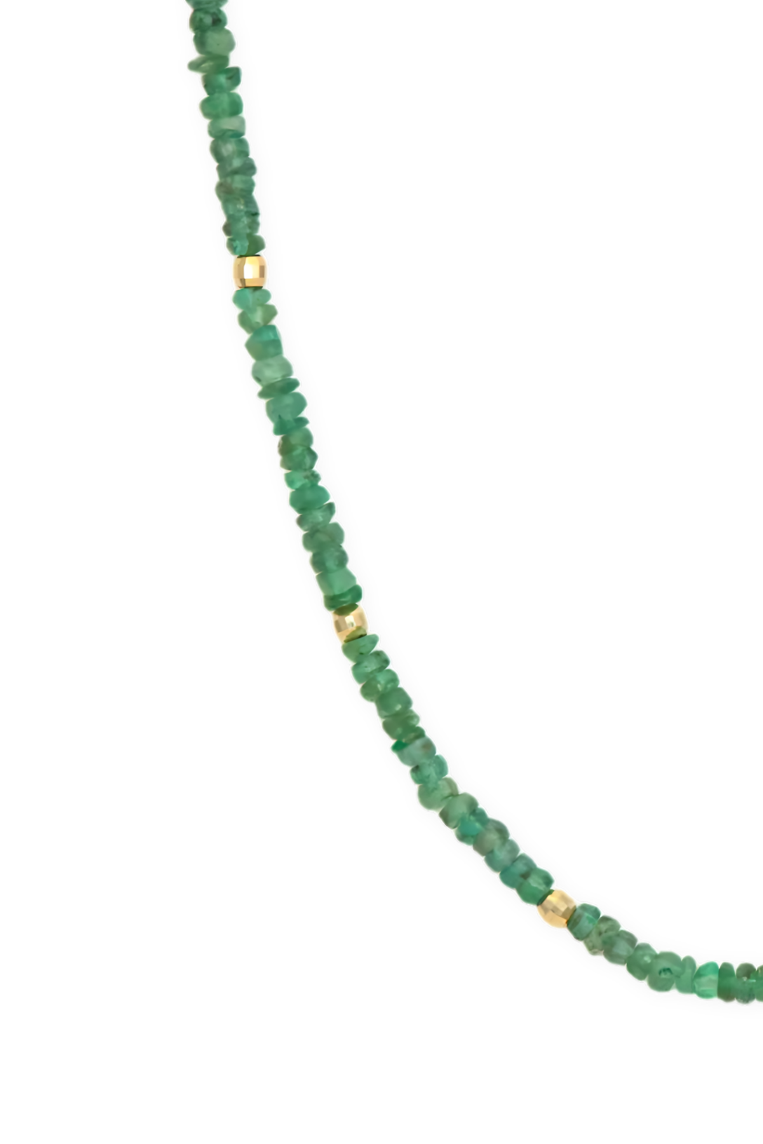 Make a statement with color! The Delicate Emerald Beaded Chain adds a POP of color to any outfit. These natural emerald beads are alternating with 14K Yellow Gold beads for a truly unique look. Wear alone or with a pendant hanging from it. Chain is adjustable from 16" to 18".