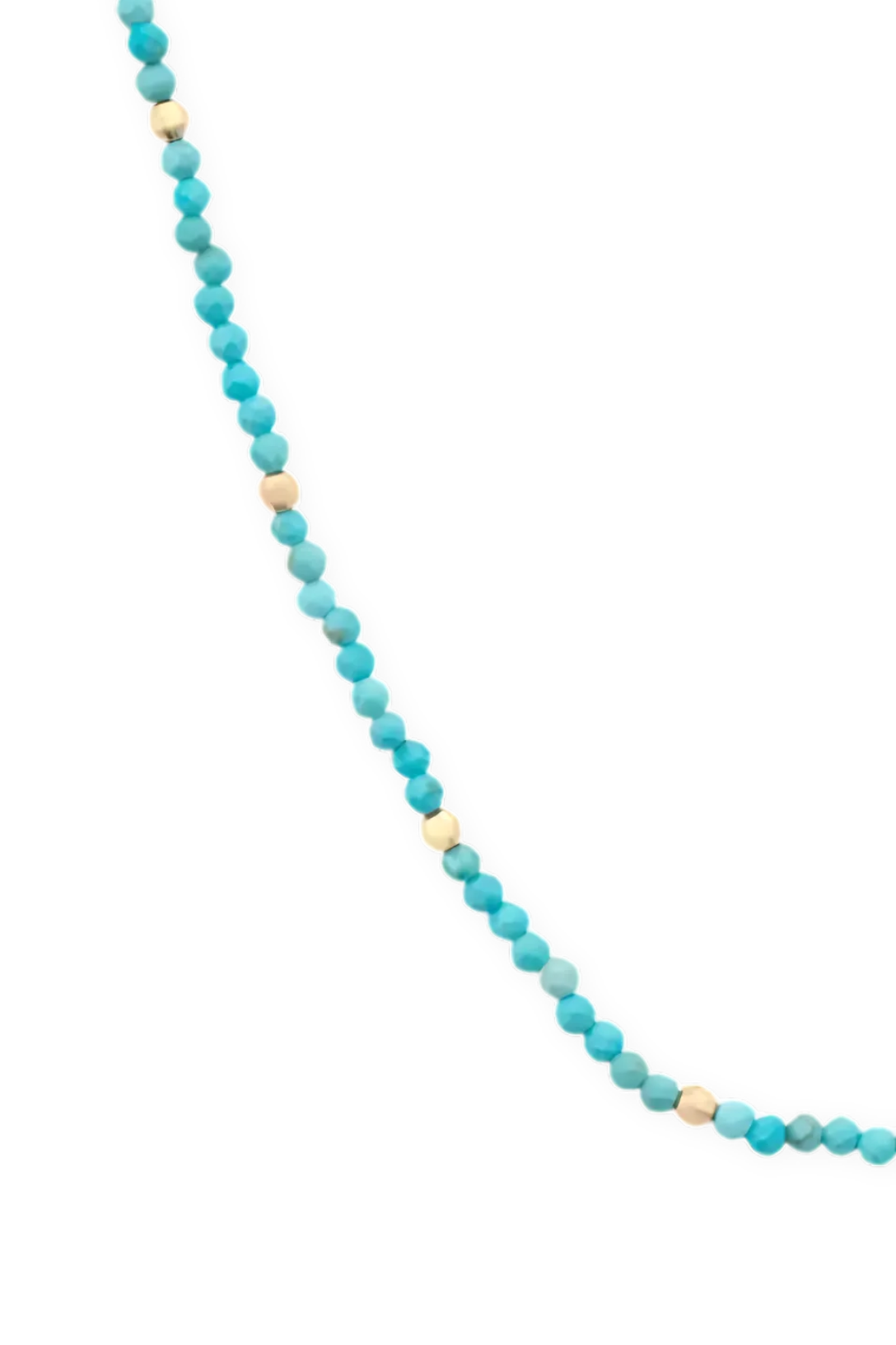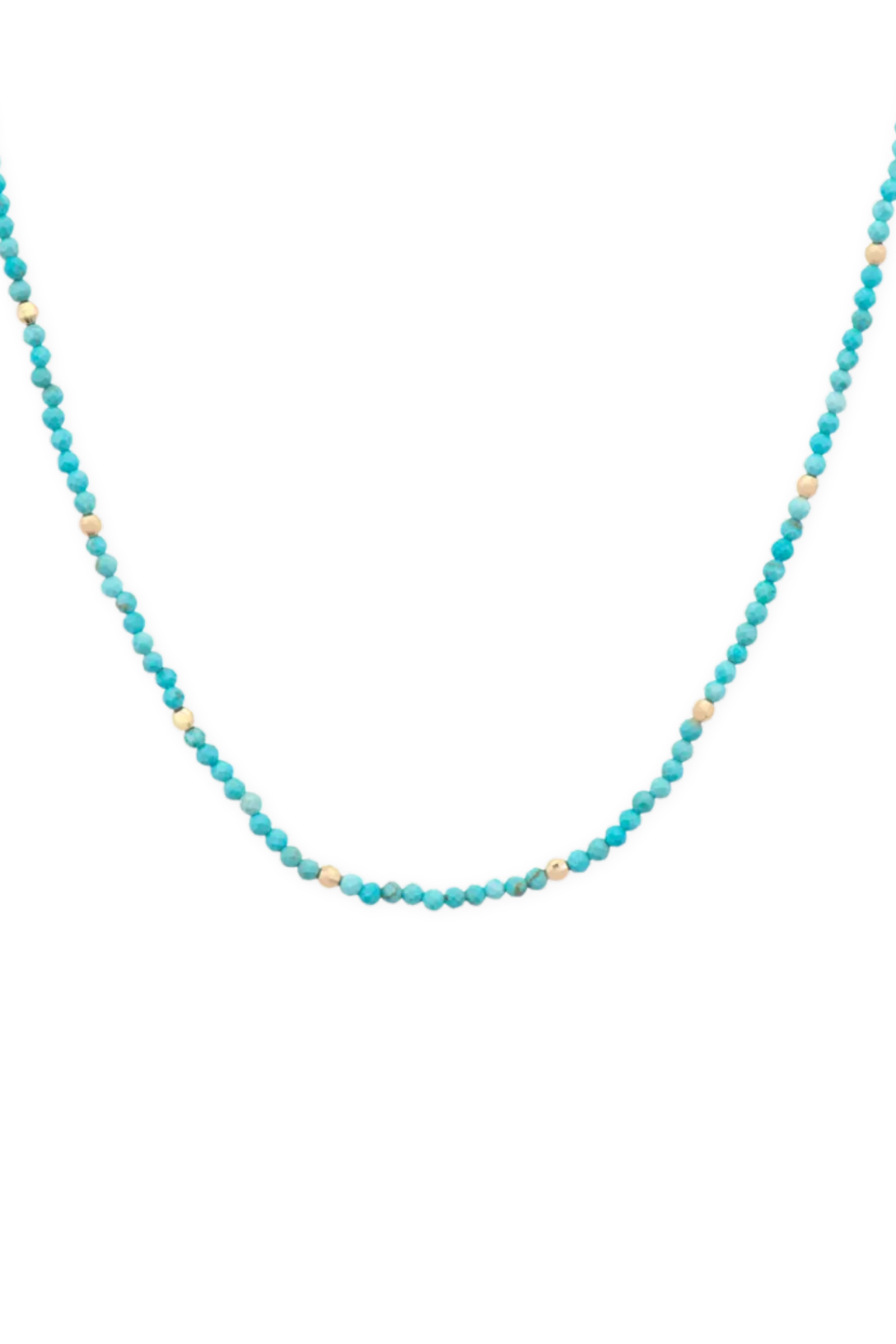 Make a statement with color! The Delicate Turquoise Beaded Chain adds a POP of color to any outfit. These natural turquoise beads are alternating with 14K Yellow Gold beads for a truly unique look. Wear alone or with a pendant hanging from it. Chain is adjustable from 16" to 18".