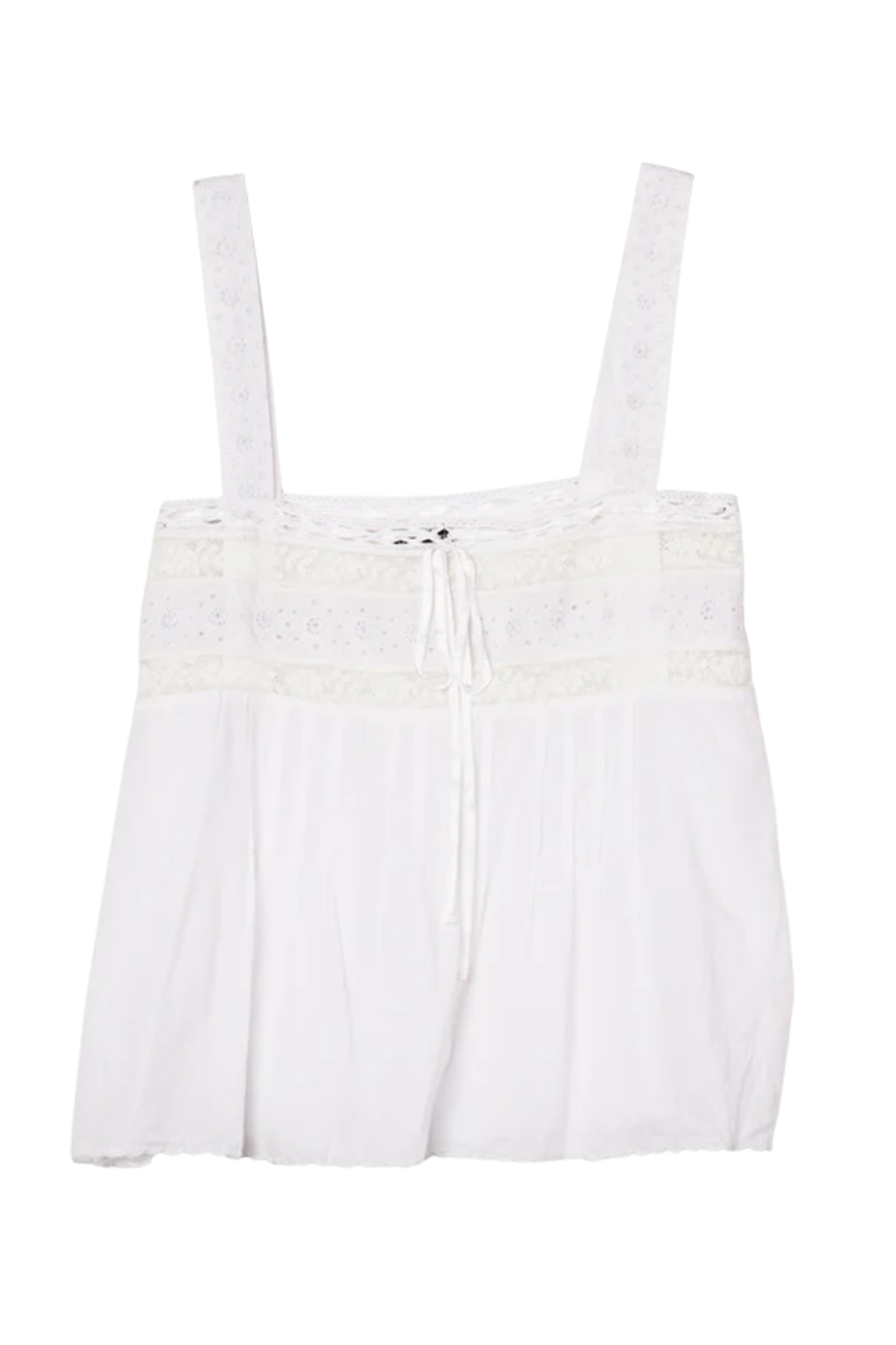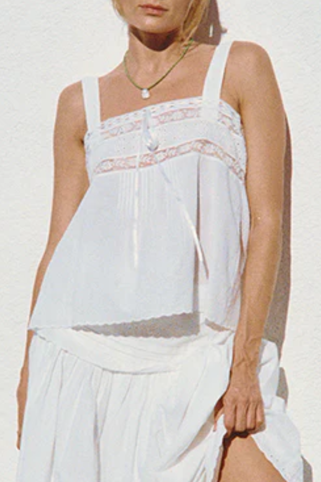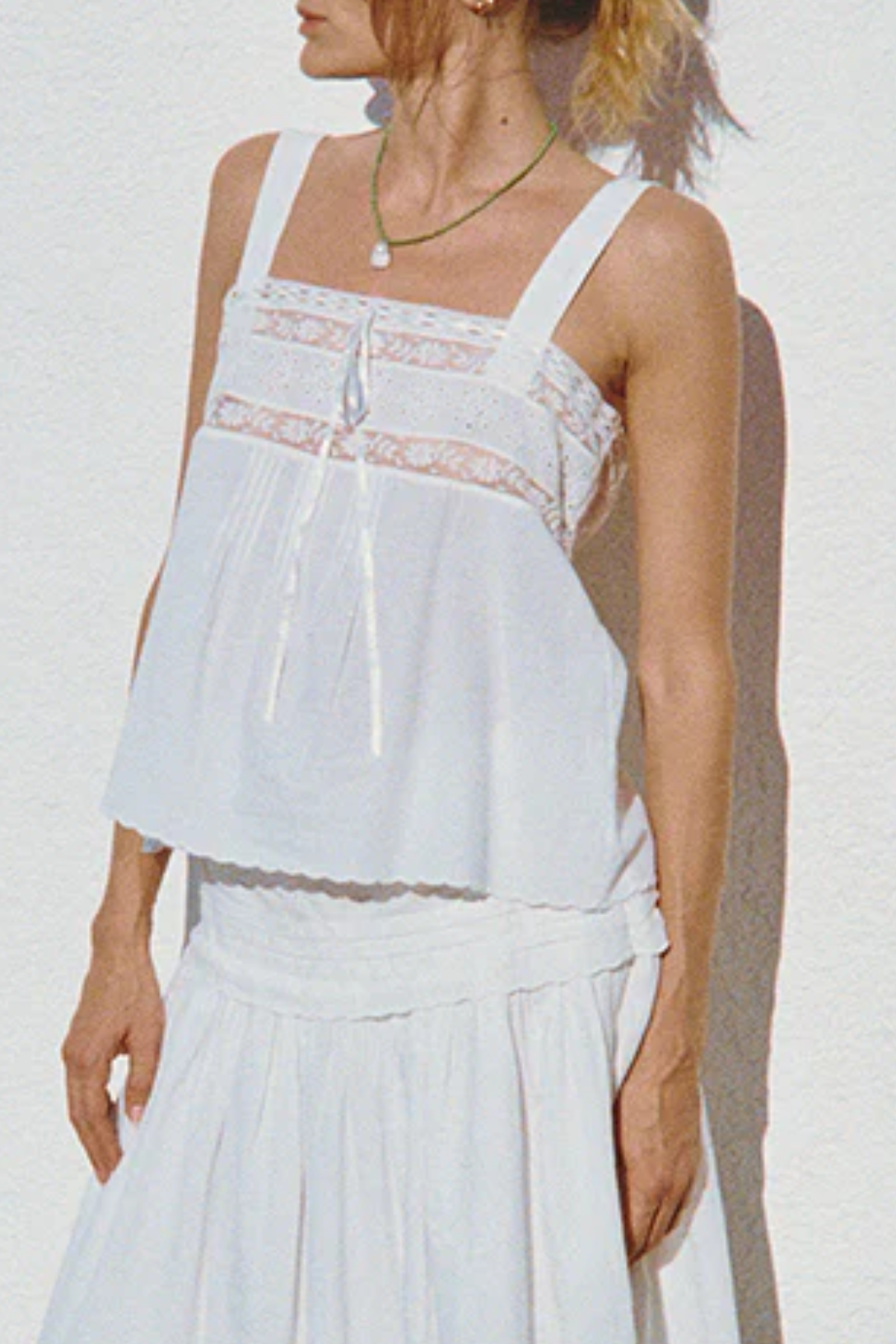 The Euri Top in White Embroidered Cotton is a women’s sleeveless top with lace detailing across the chest, embroidery along the hem, and tied with a ribbon bow in front.
