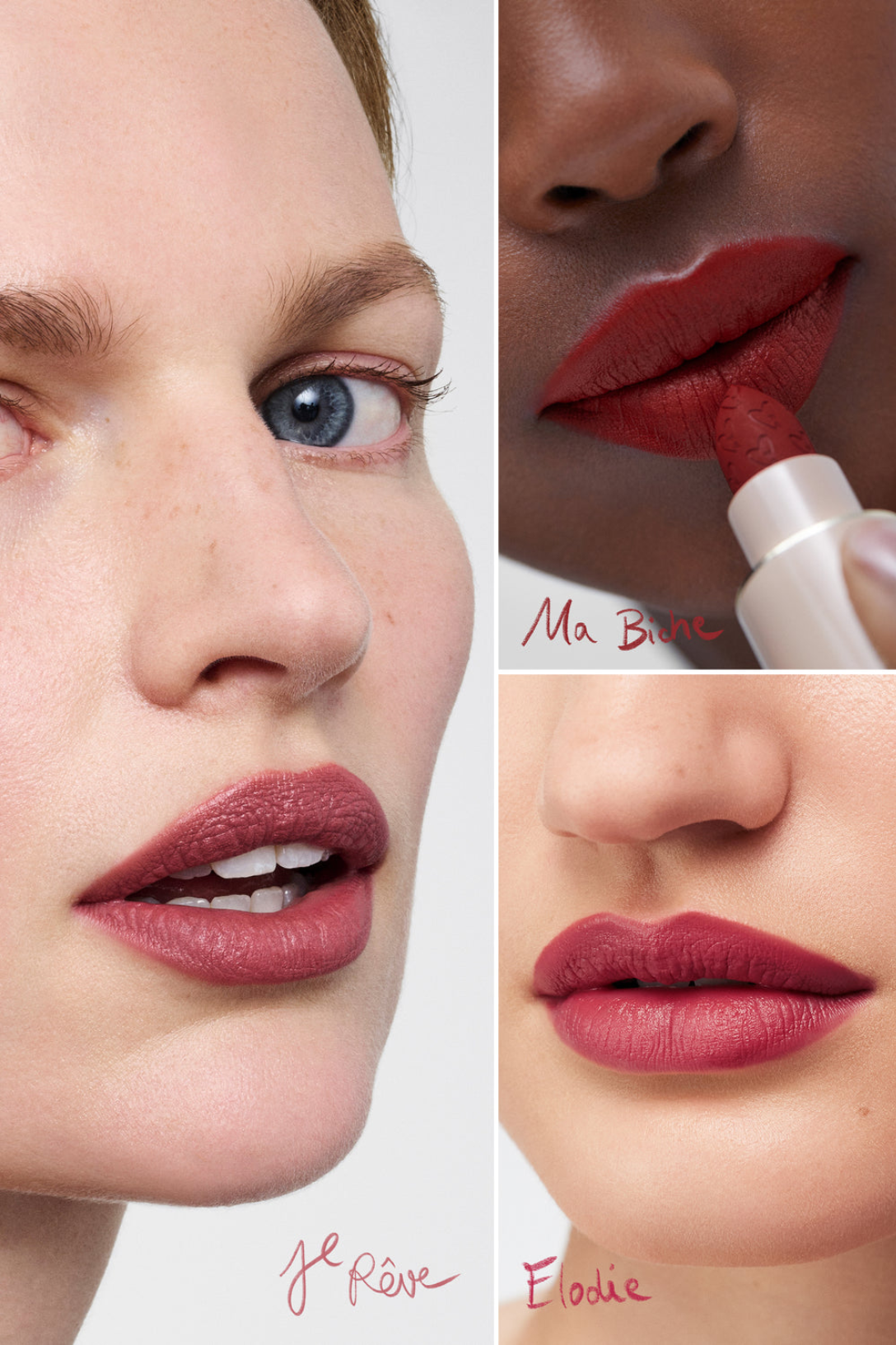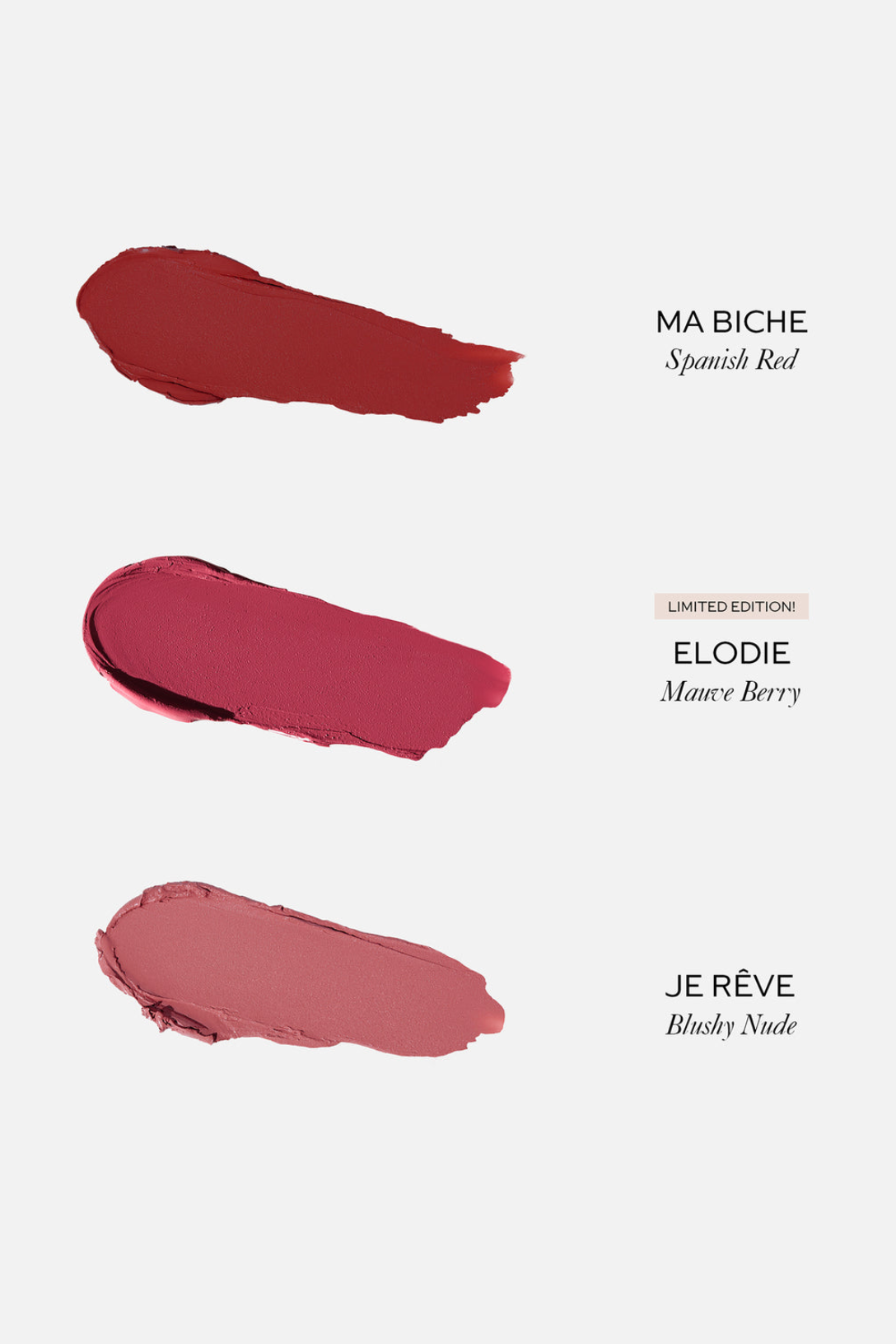 Customize your look for every holiday outing with bestselling blushy nude Je Rêve, bold Spanish red Ma Biche, and new, limited-edition mauve berry Elodie.