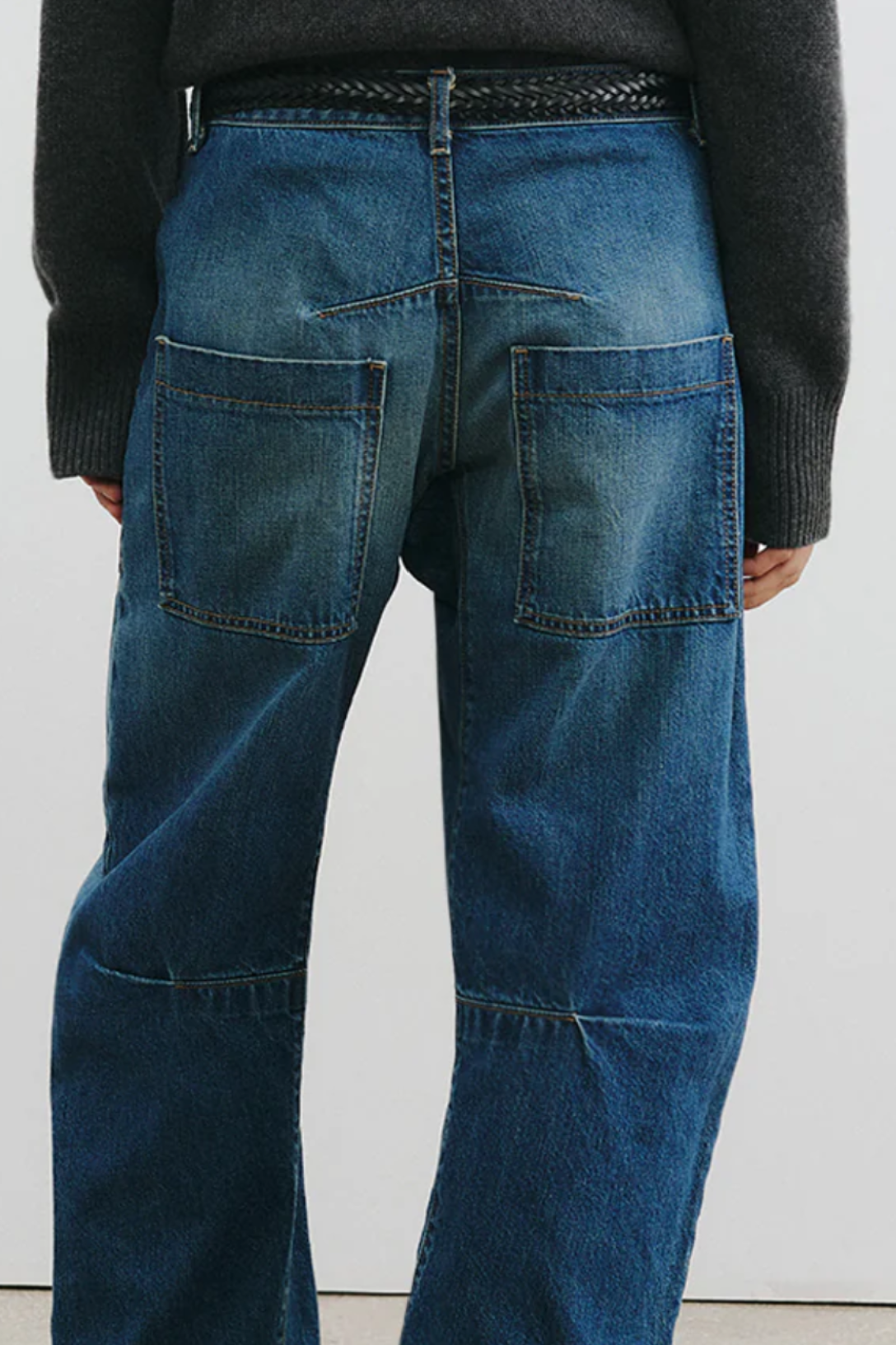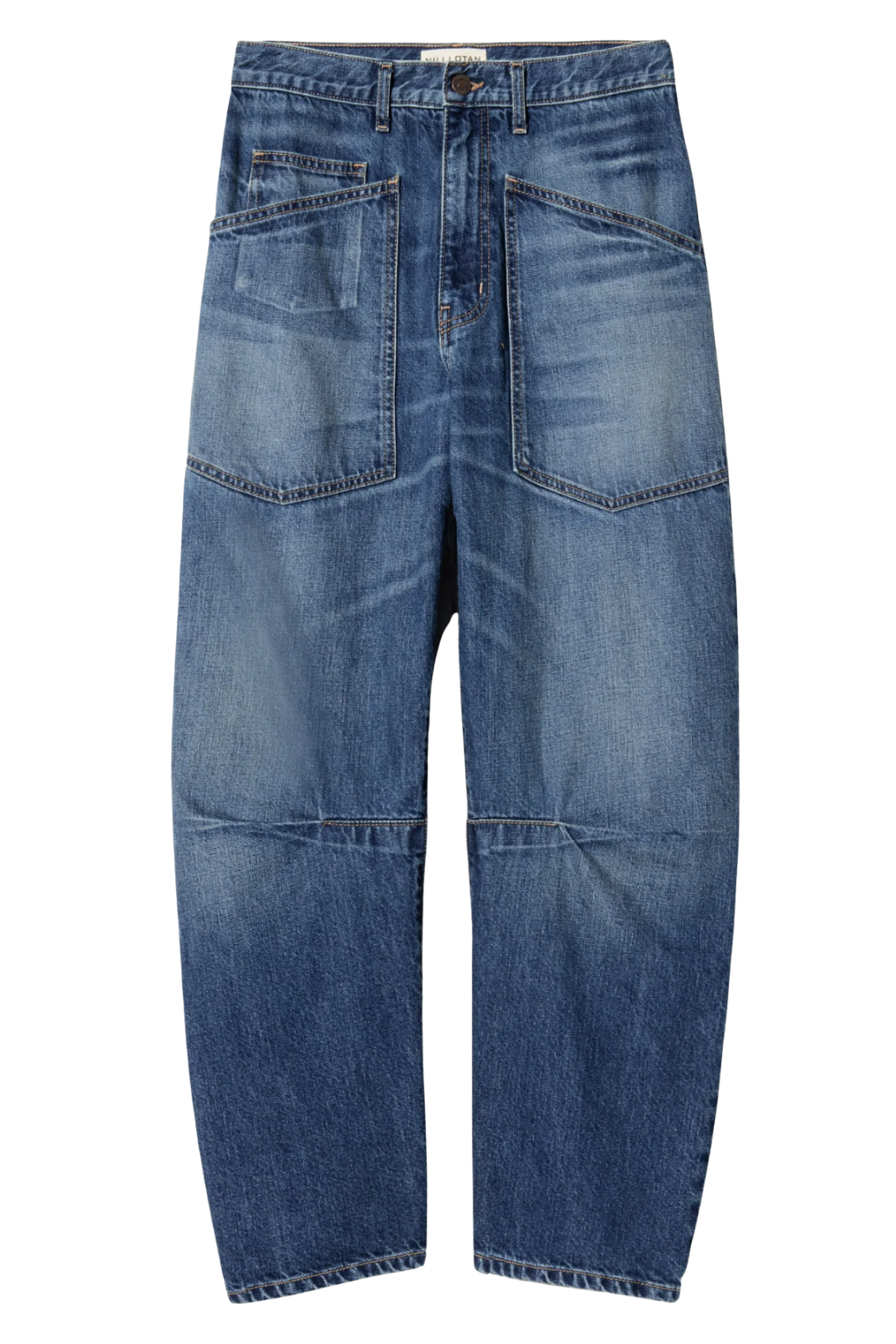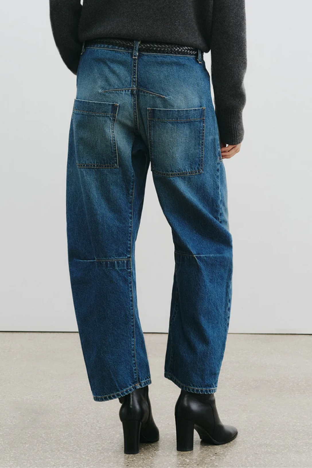 Mid-rise, relaxed fit barrel leg jean in Japanese mid-weight non-stretch denim. Uniquely curved silhouette. Seam detail at knees. Gusset at inseam. Zip fly. Shank closure. Top-stitched front and back patch pockets. Belt loops.