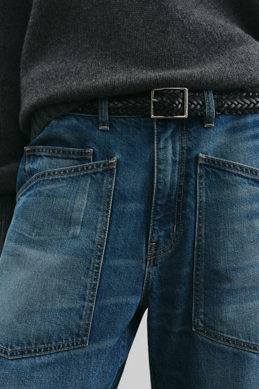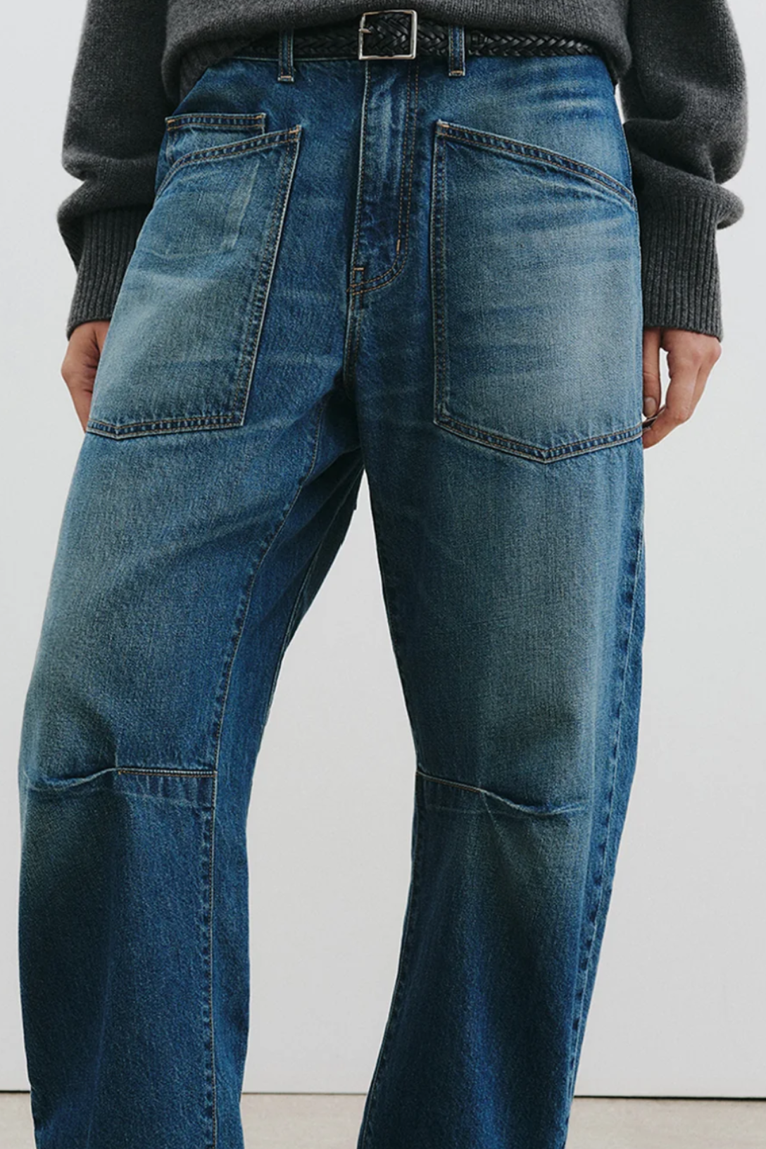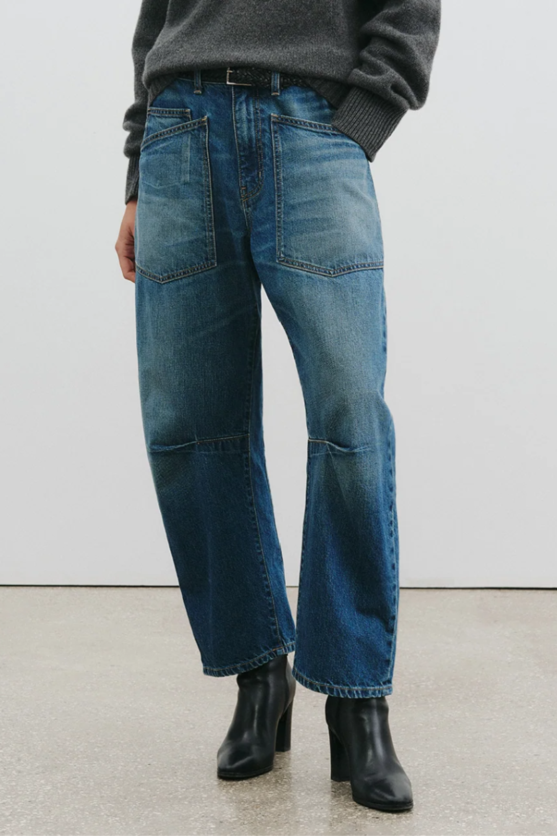 Mid-rise, relaxed fit barrel leg jean in Japanese mid-weight non-stretch denim. Uniquely curved silhouette. Seam detail at knees. Gusset at inseam. Zip fly. Shank closure. Top-stitched front and back patch pockets. Belt loops.