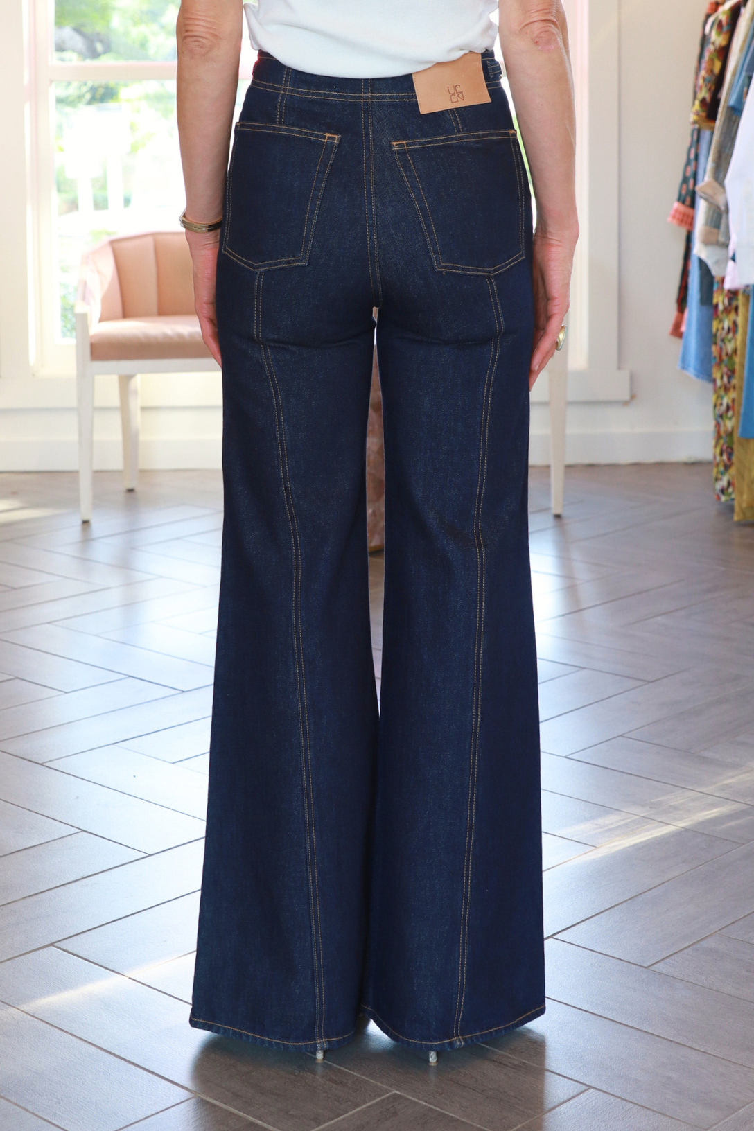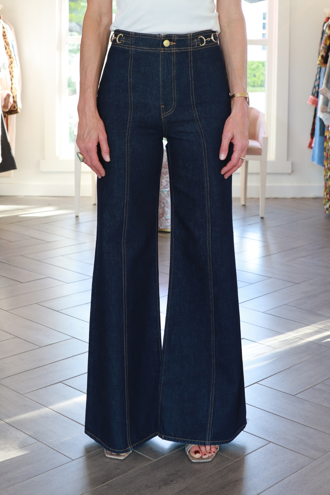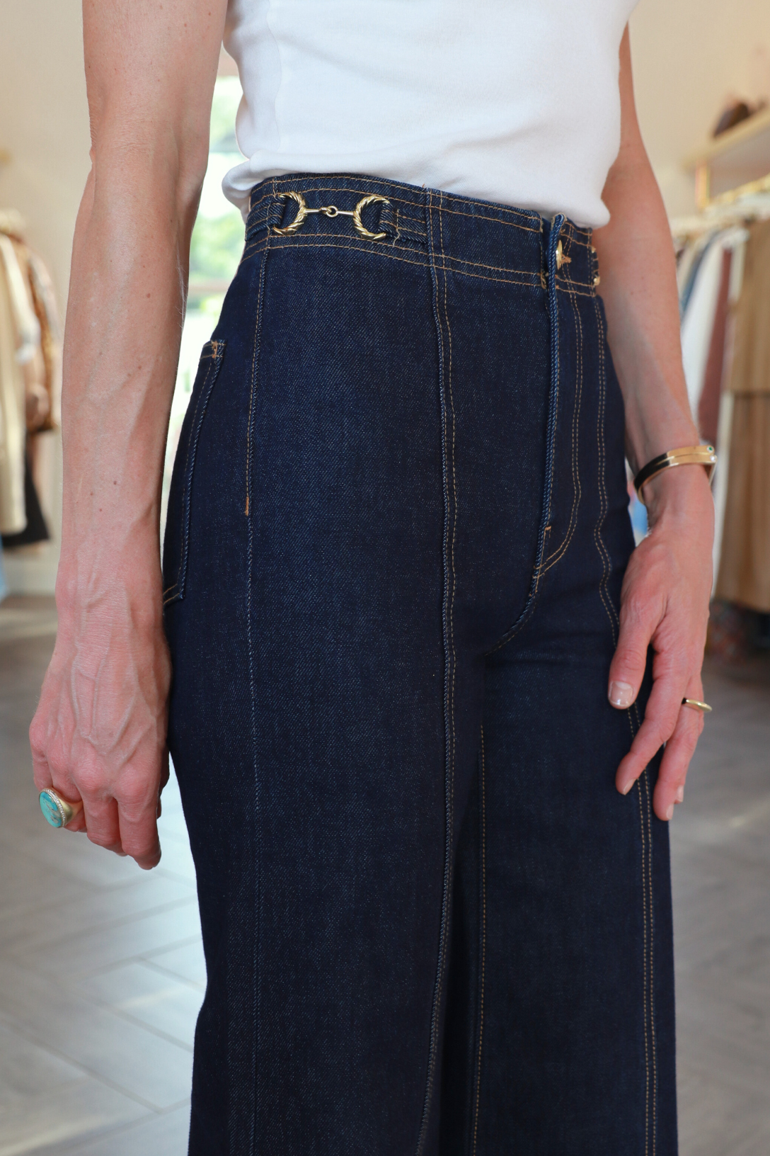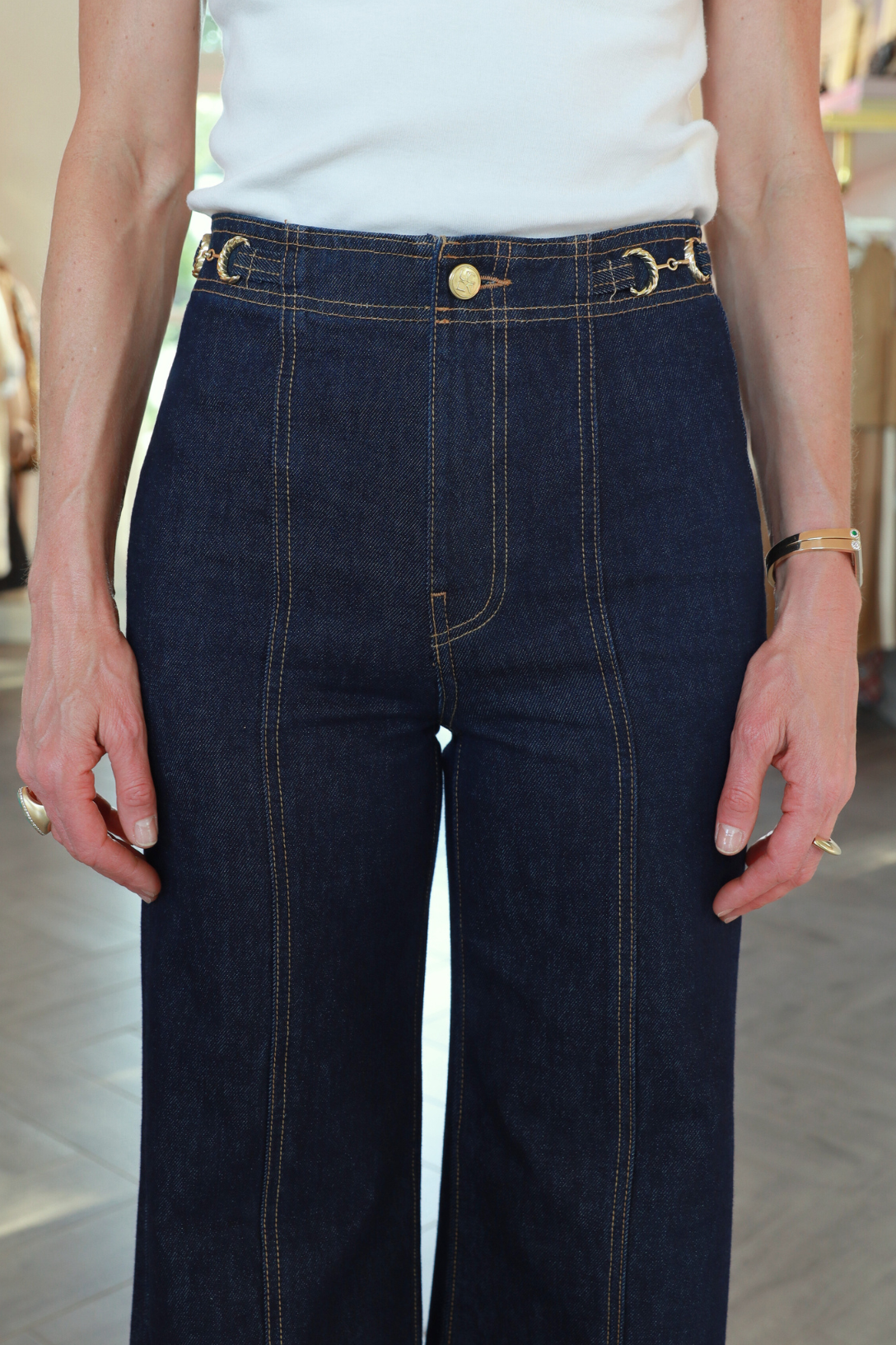 Debuting in Look 4 on the AW25 runway, the Delphine Jean is the newest addition to the Ulla Johnson denim lineup. The deep indigo and contrast stitching evoke vintage allure, while the Hollywood waistband creates a clean finish. Custom twisted gold hardware finishes this elevated essential.