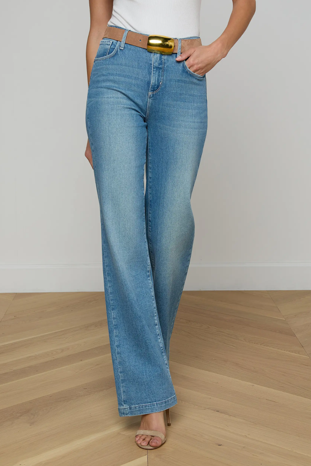 A polished wide-leg jean, fitted and flattering through the hips. Constructed with a contoured waistband that hugs the natural waist without gaping, the Clayton is also L'AGENCE's tallest wide-leg jean. Now back in a light blue denim wash.