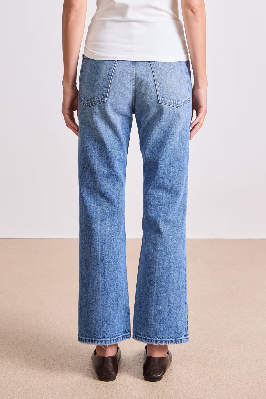 A revamped version of Apiece Apart's best selling Rene Pull on Pant — designed with a cool kick flare for everyday ease.  The Hermosa is perfectly broken in with slight whiskering and fading, which will become softer with each wear while maintaining the character and look of the jean.