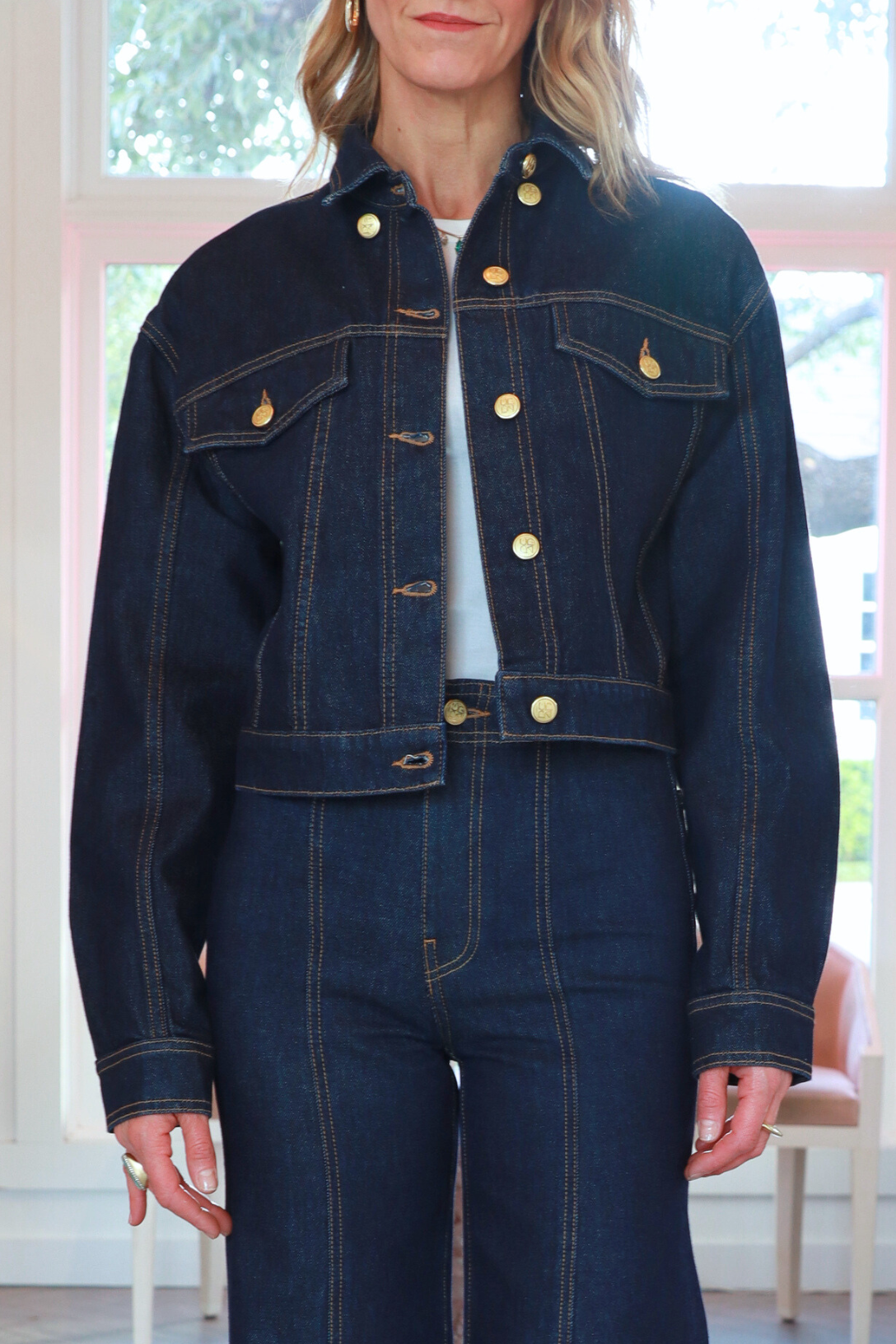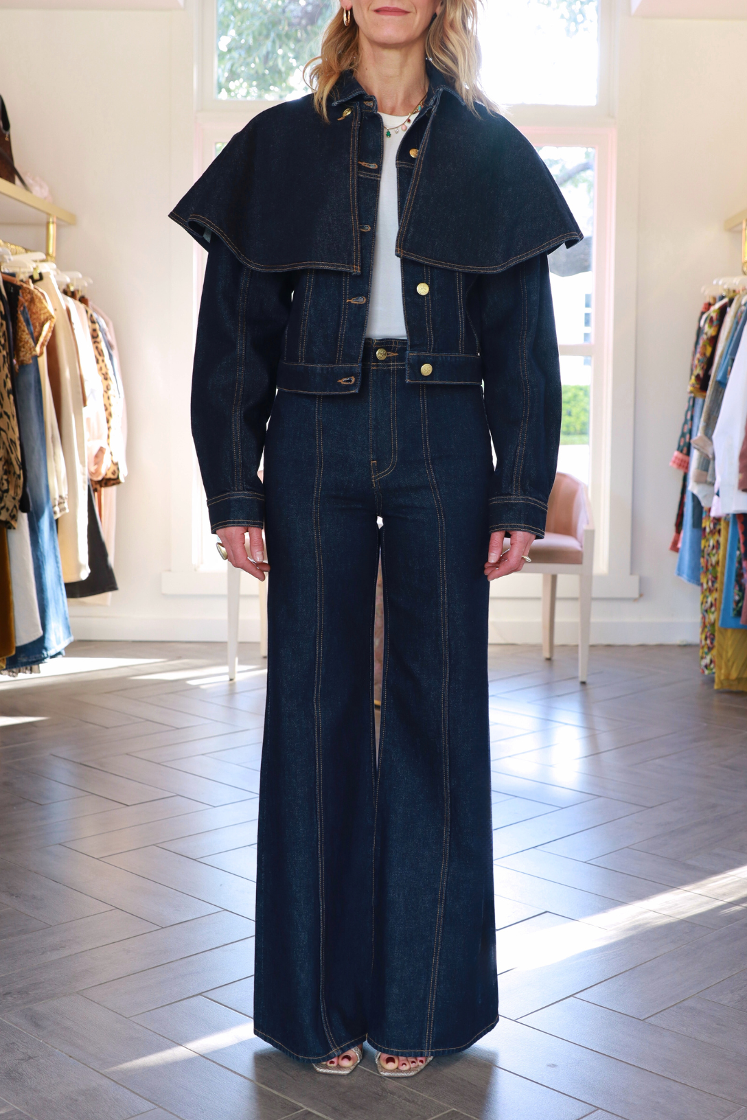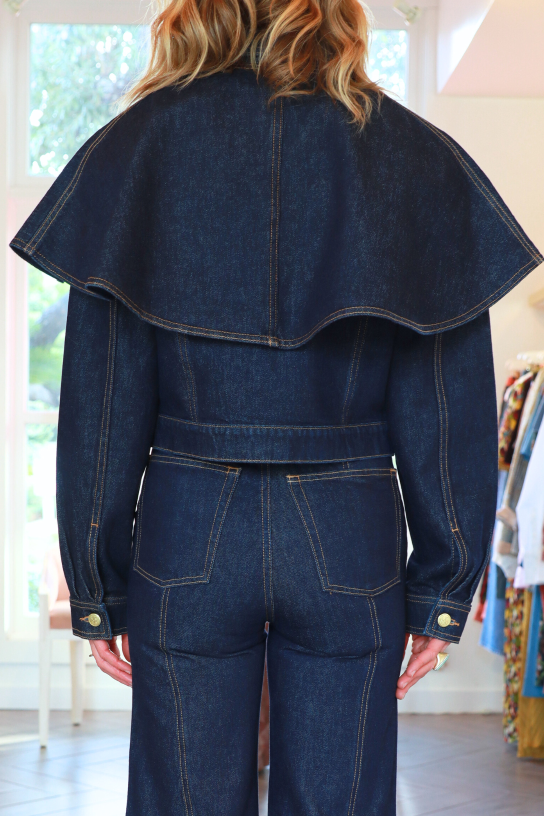 Look 15 from the AW25 runway, the Agata Jacket fuses a timeless denim staple with utilitarian suiting. Handmade in Los Angeles, it features a removable cape overlay and a deep, vintage-inspired indigo wash. Custom monogram-adorned buttons finish this elevated layer, perfect for day to night.