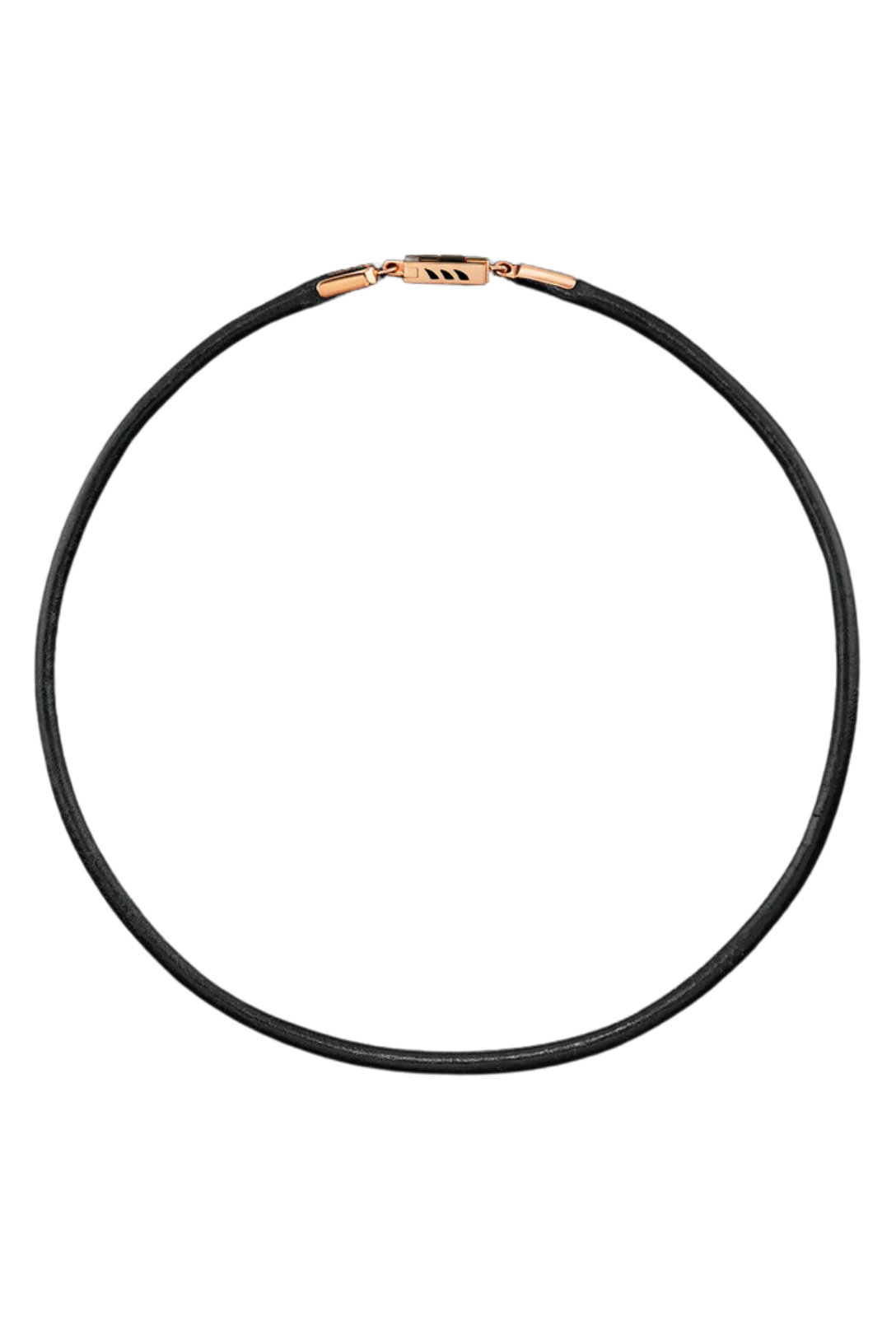 Leather cord necklace with 18K Rose Gold and black enamel shark fin enamel closure.