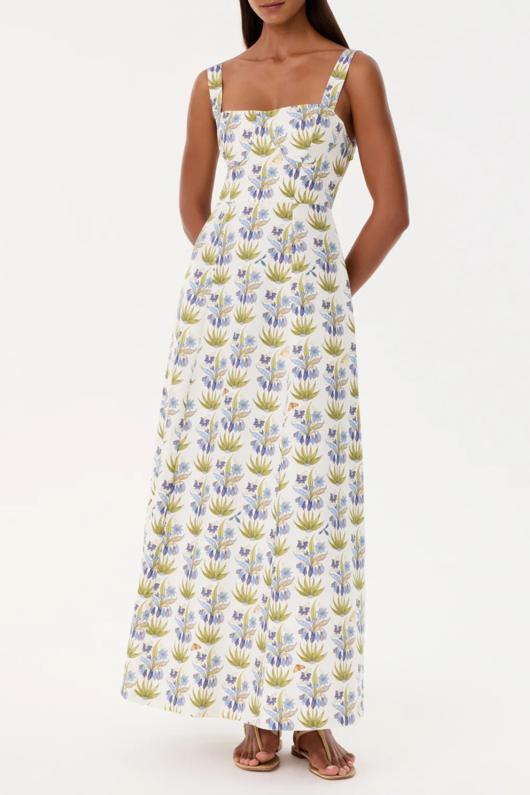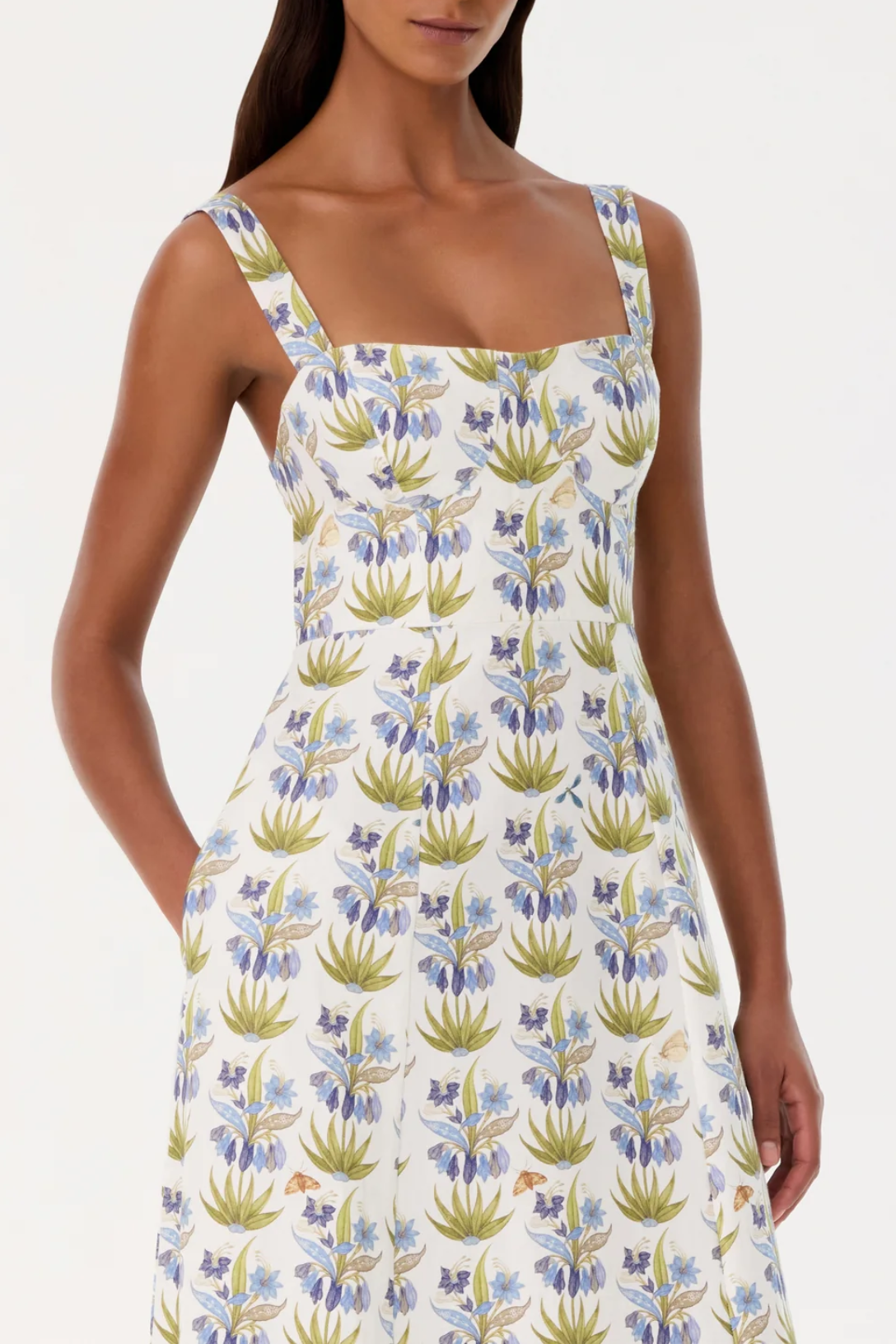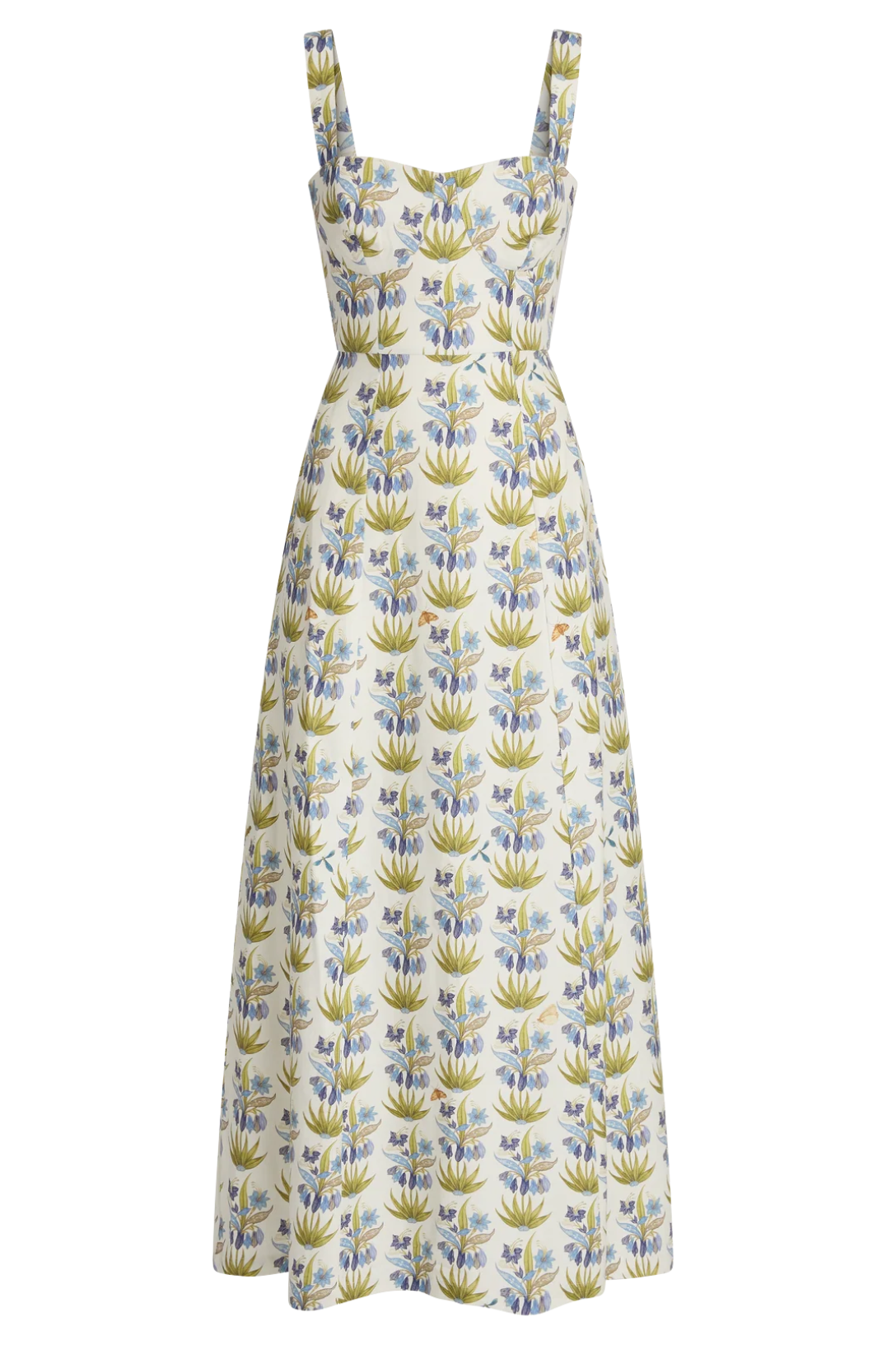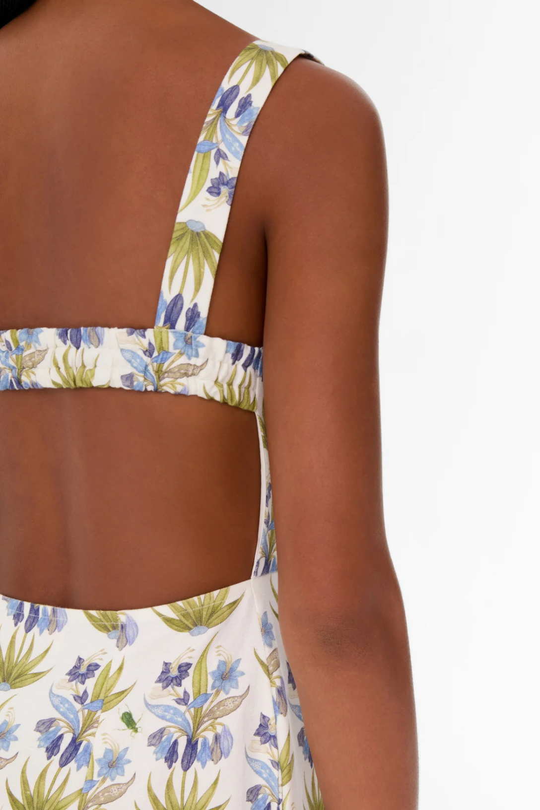 A quintessential open-back silhouette, the Azzurra Dress returns in the Celestine Flower print—a delicate bellflower motif borrowed from a botanical miniature painting designed for Emporio Sirenuse in Jaipur.