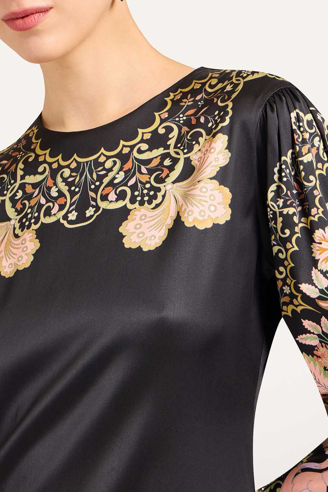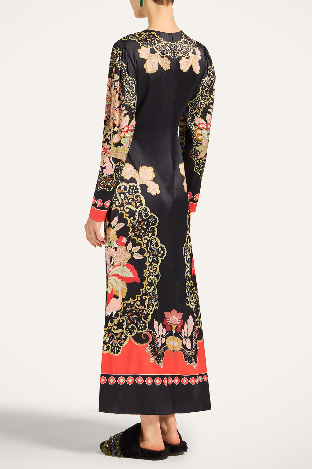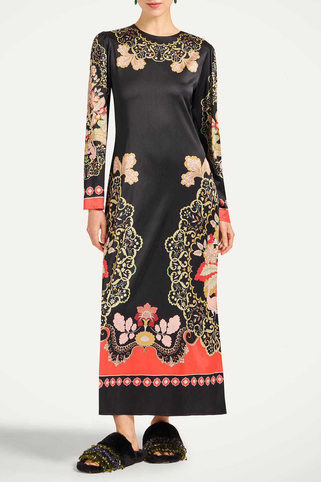 It’s the Long Sleeve Swing Dress you know and love, now in a more sensual, figure-hugging fit. With a curve-celebrating body that flares out at the hips into an ankle-grazing skirt, La DoubleJ crafted this beauty in a drapey Italian satin strewn with La DoubleJ's abundant Cornucopia print destined to twirl from date nights to dancefloors this party season.