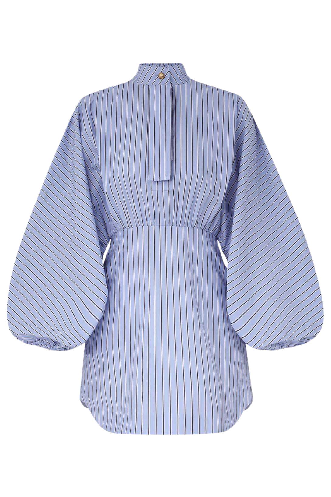 The Drawstring Stripe Mini Dress in Hydrangea Stripe from Zimmermann's Cruise 2026 Collection, Twisted Romance. A mini dress featuring a stand collar with a detachable necktie, long blouson sleeves and an elasticated waist.