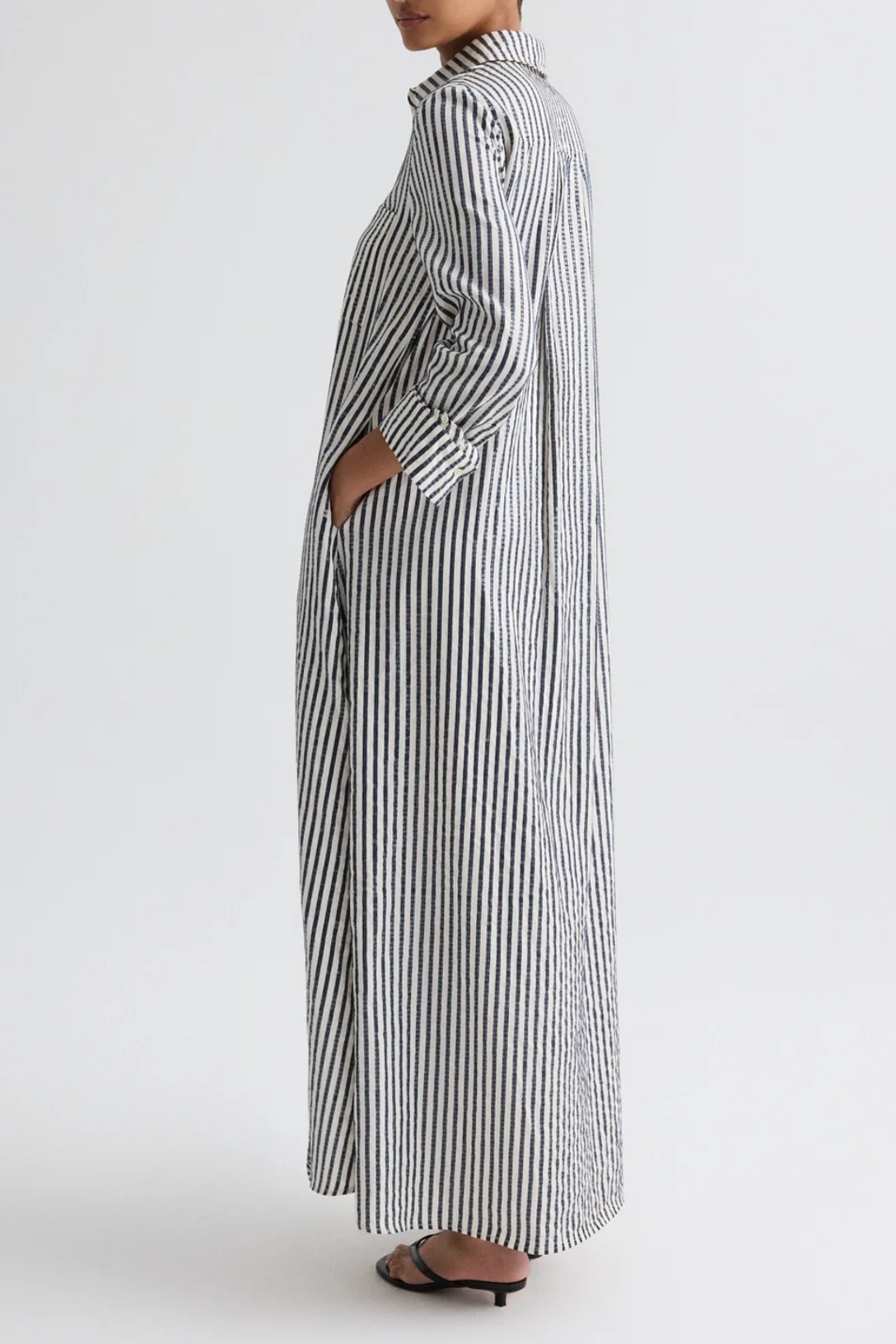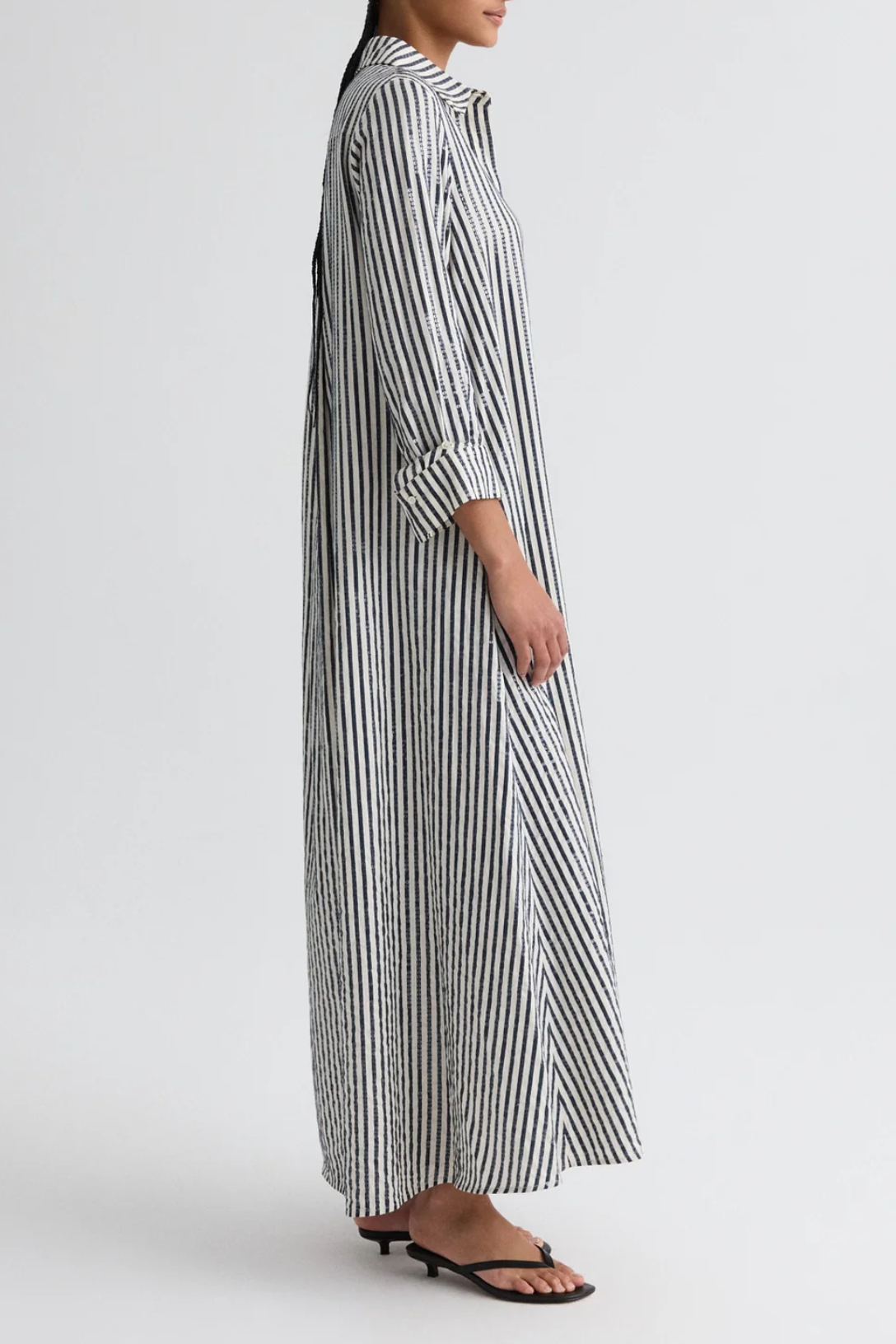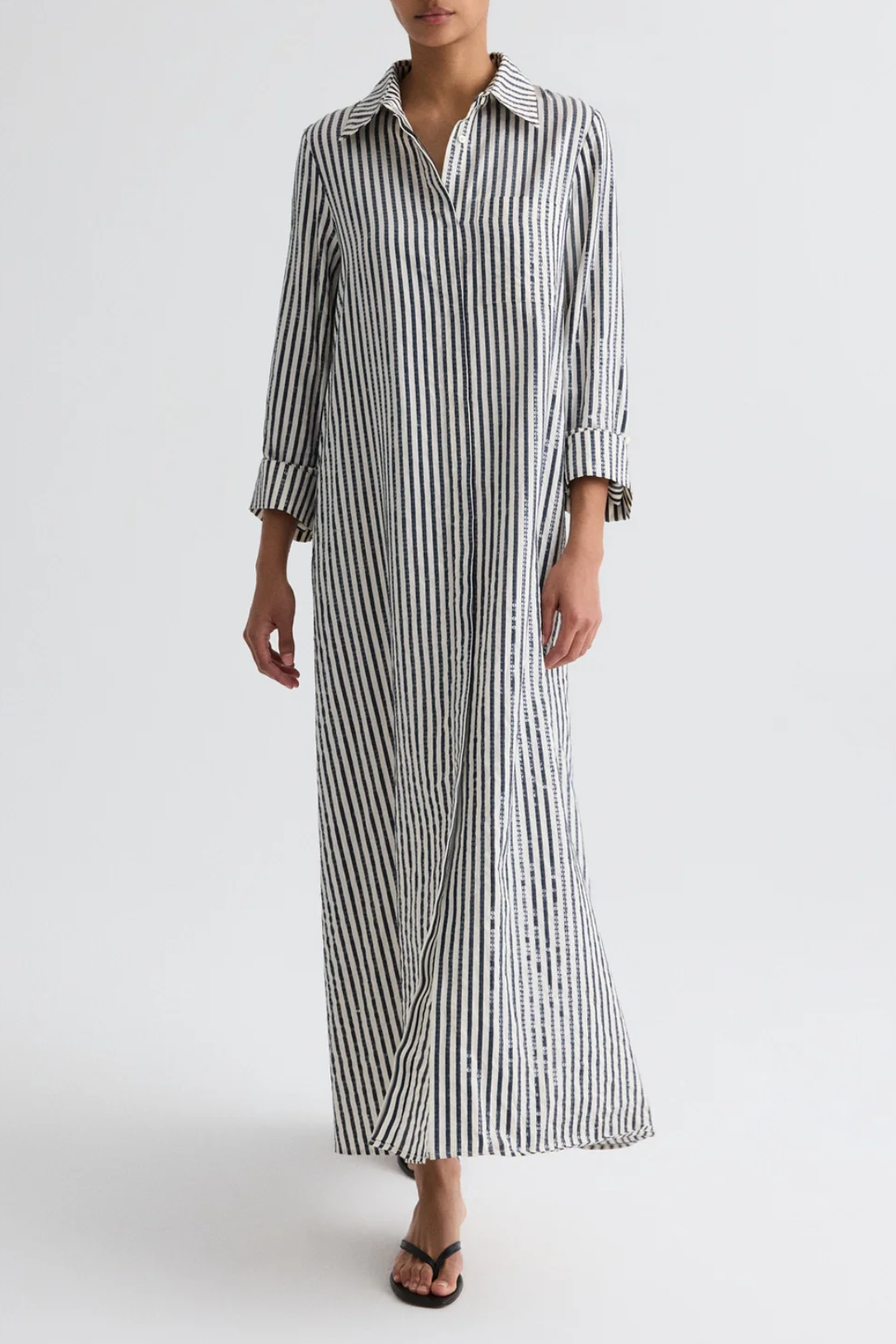 Oversized maxi shirt dress in clear sequin on stripe. Fabric is superfine Italian cotton shirting embellished with clear sequins. Jenny's Gown is a relaxed A-line silhouette. Complete with a button up placket, chest patch pocket, spread collar, and TWP's signature single roll button cuffs.