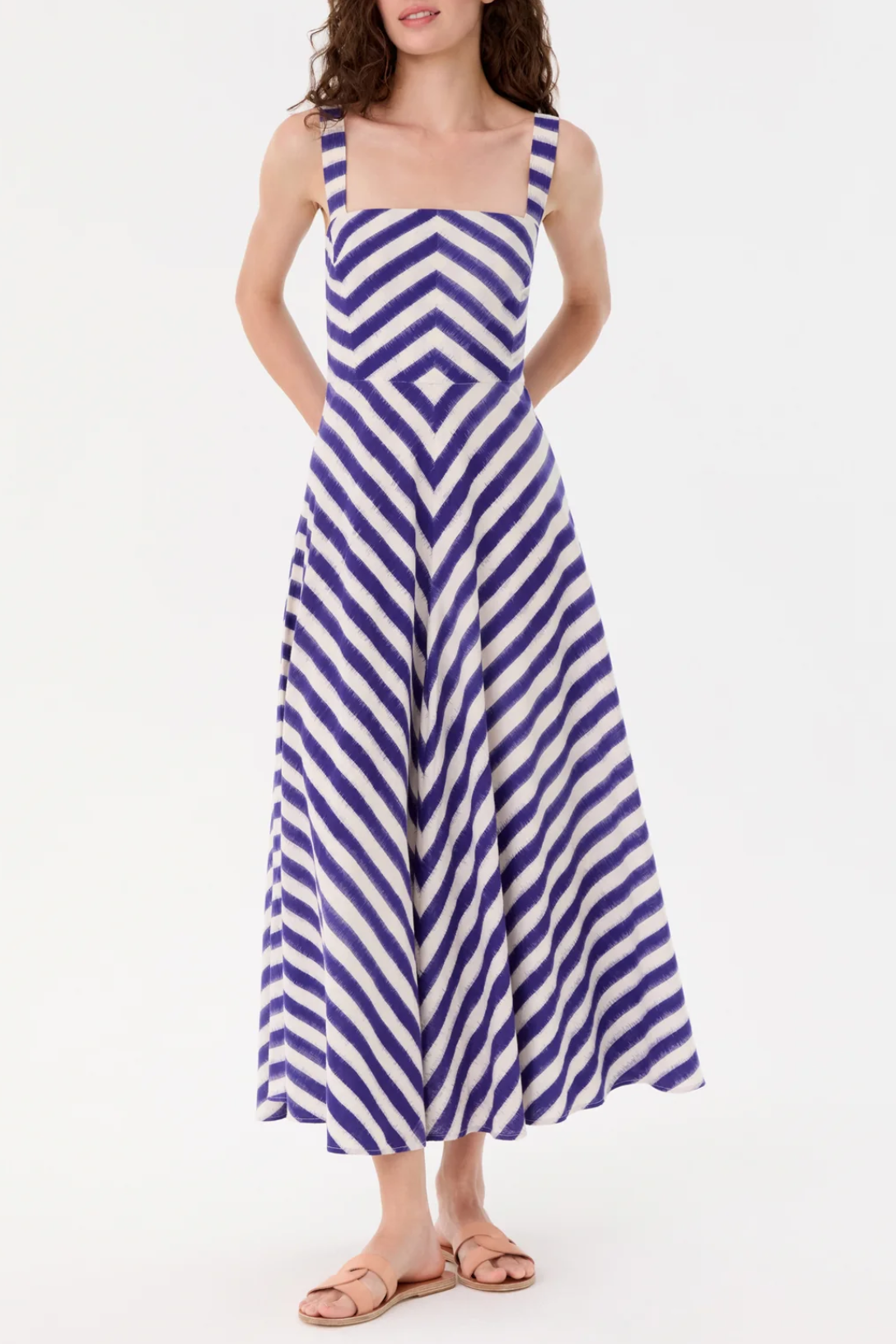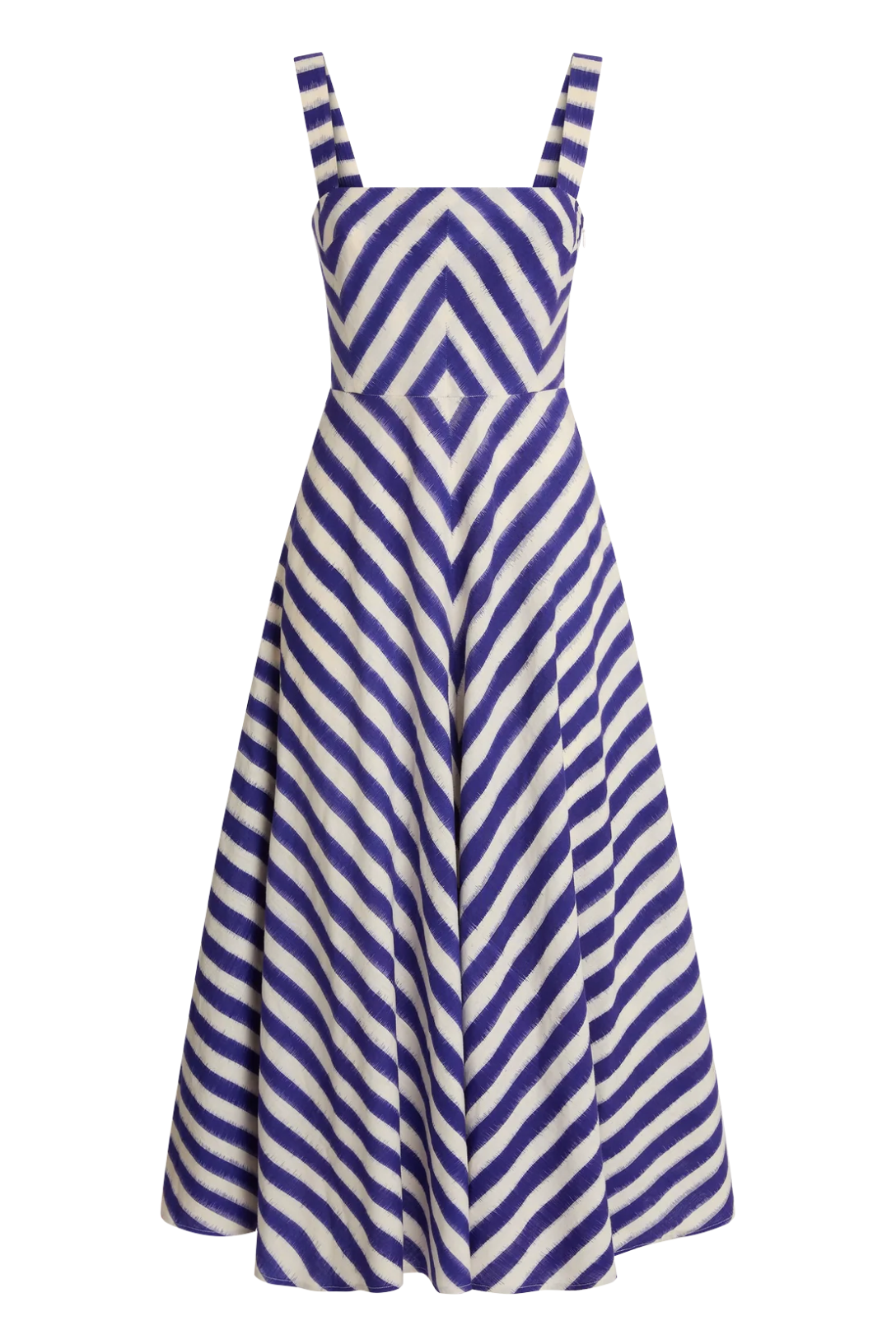 Handwoven on traditional looms from pre-dyed cotton yarns, the Margherita Dress captures the expressive rhythm of our signature Ikat Stripes. Its rhombus-centered geometry comes to life in a flattering sundress silhouette with a soft, bias-cut drape.