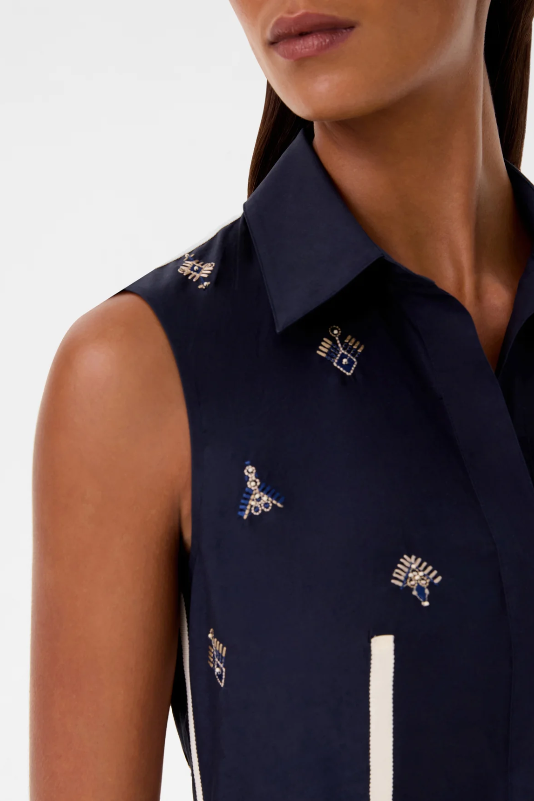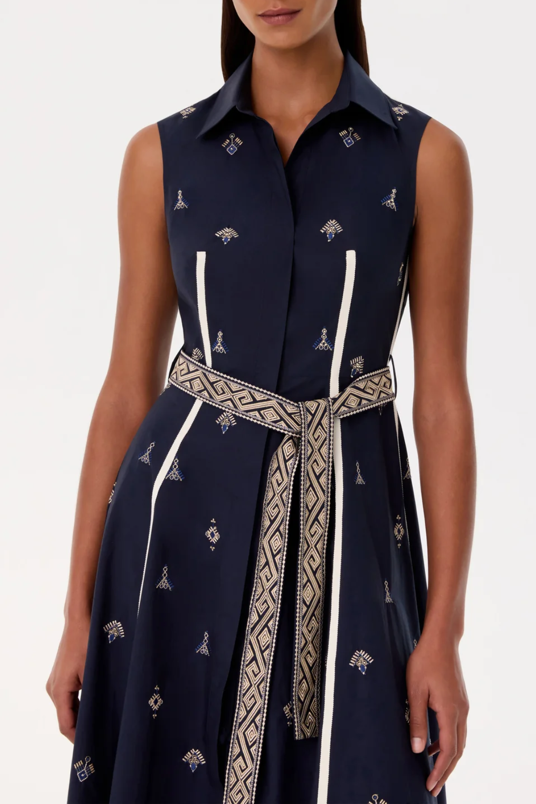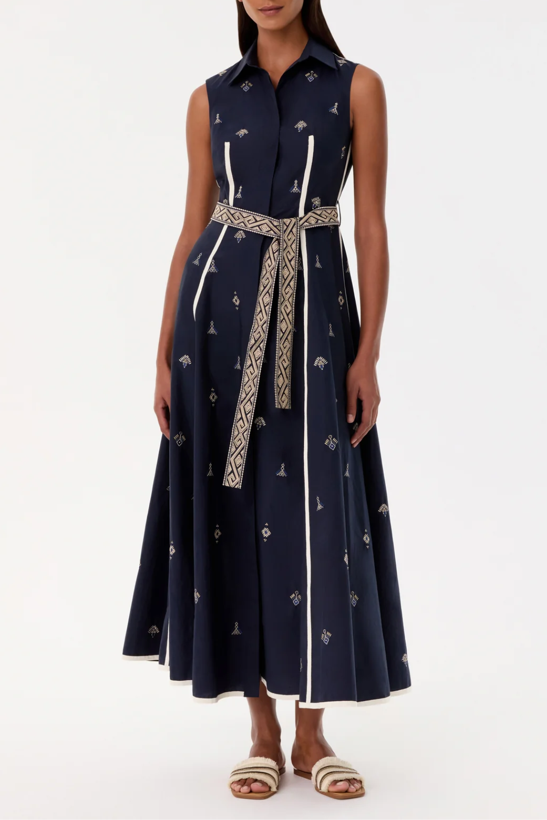 Part of the Iris embroidery capsule, the Miralda Dress reinterprets a signature Emporio Sirenuse silhouette with architectural grace. Cut from crisp cotton poplin, it’s embroidered throughout with geometric motifs and framed by grosgrain trim. A detachable embroidered belt completes the look, adding definition and contrast against the navy-blue backdrop.