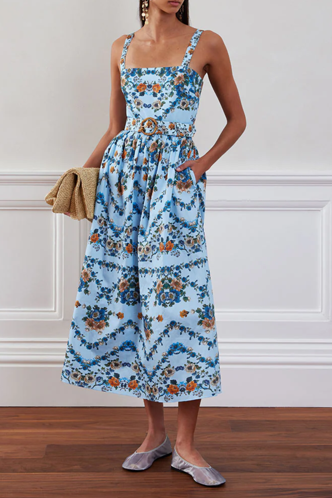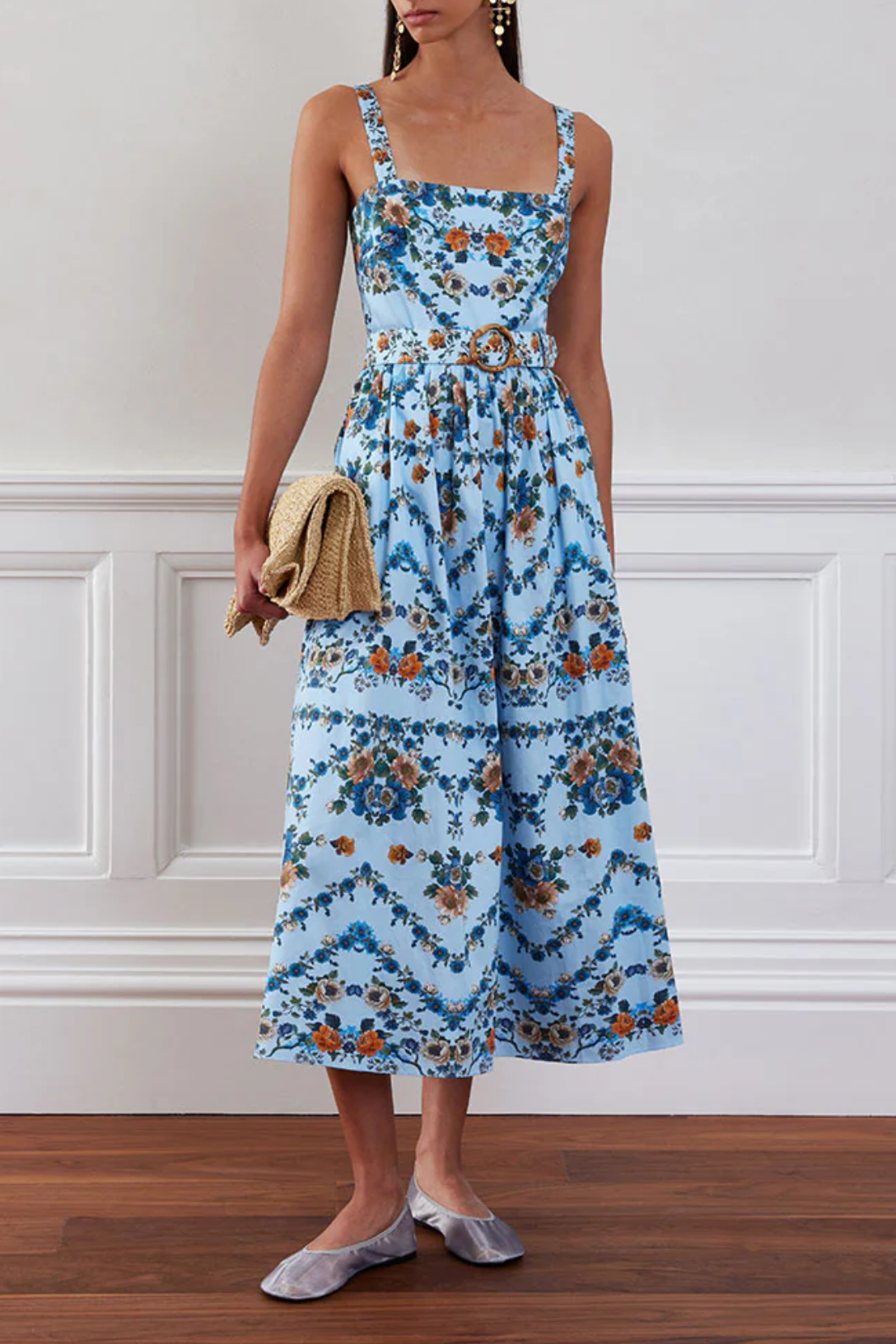 A clean, modern silhouette with a universally flattering square neckline. Ninet returns in Borgo De Nor's Magic Blossom placement print - warm blues, moss greens and burnt oranges framed by a new wicker-style belt buckle. Easy, uplifting and endlessly wearable.