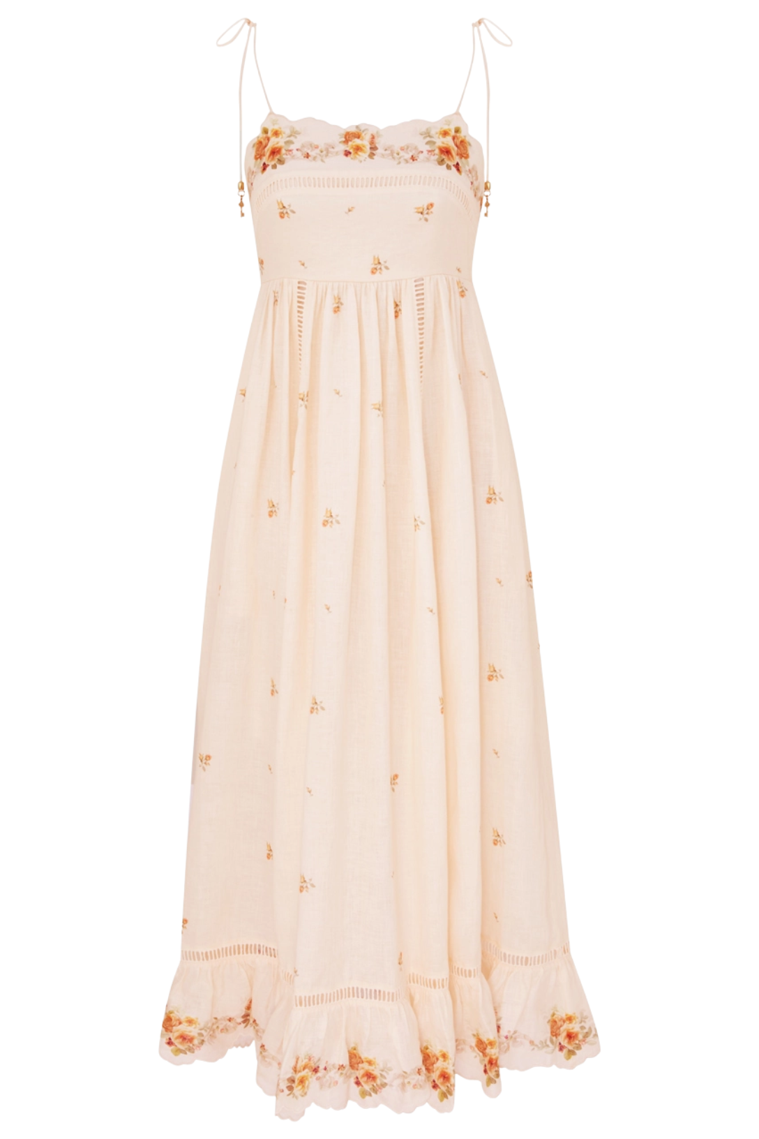 The Patience Cami Midi Dress in Cream/Yellow Rose from Zimmermann's Resort Swim 2026 Collection. A linen midi dress featuring a straight neckline, self-tie rouleau straps and functional side pockets, finished with an invisible zip closure at center back and pleated skirt.