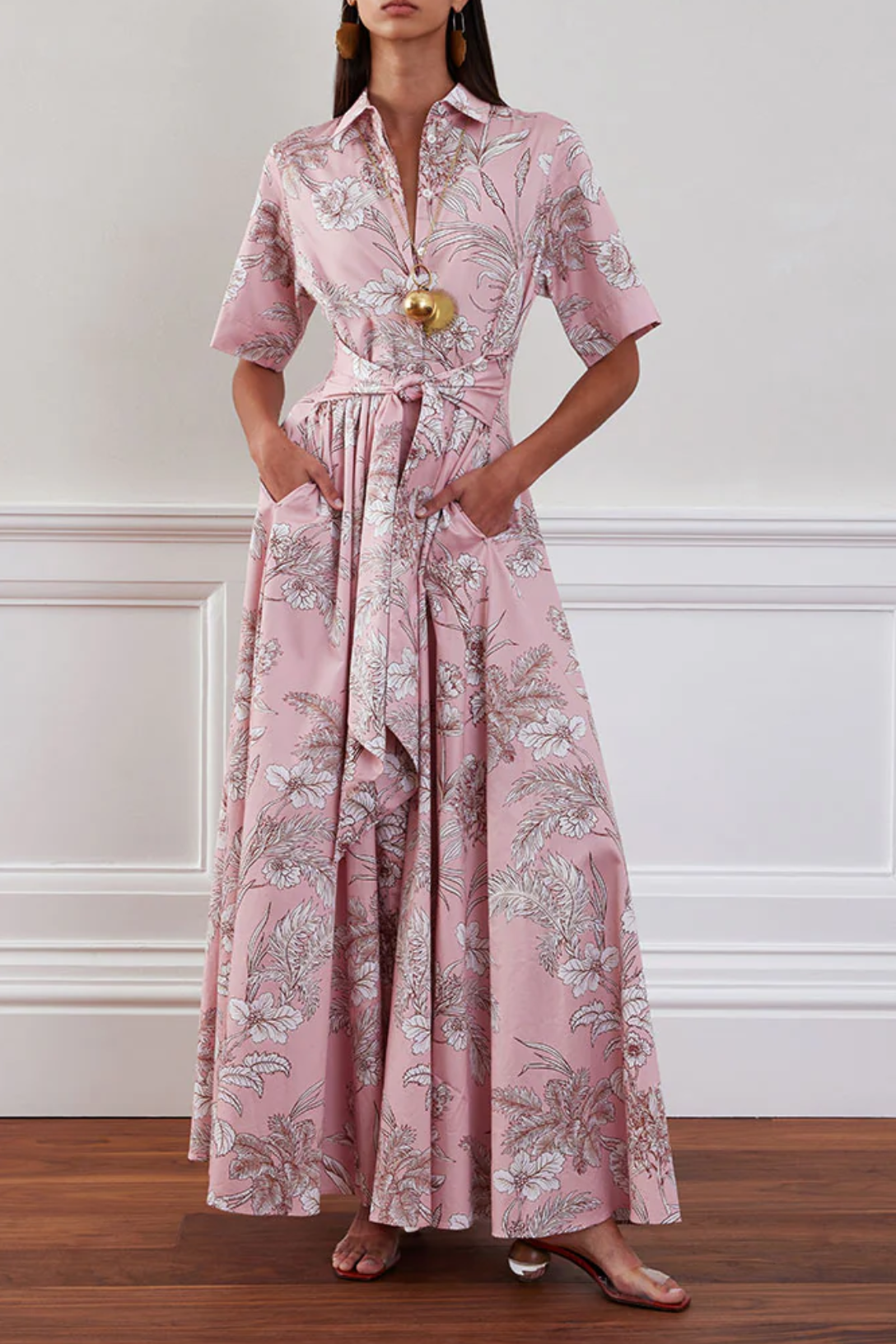 A modern take on the shirt dress: boxy sleeves, a cinched waist, pockets and a dramatic button-down skirt that moves beautifully. In Jungle Pink, a powder-pink and maroon tropical print, Posie is minimal in structure, maximal in effect.