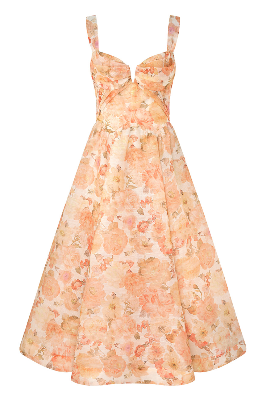 The Rebellion Drape Midi Dress in Golden Bloom from Zimmermann's Cruise 2026 Collection, Twisted Romance. A silk-linen organza midi dress featuring a sweetheart neckline, drape detailing at the bust and a full flared skirt.