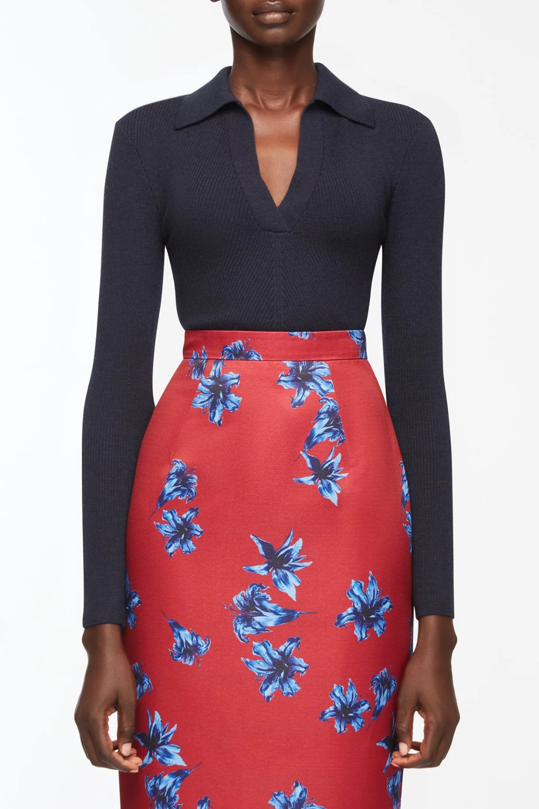 The Austin Knit Top is a refined wardrobe staple, crafted in dark navy knit with a cashmere-soft feel. Designed with a flattering, close fit, its long sleeves and polo neckline lend an understated elegance, making it the perfect transitional piece this season.