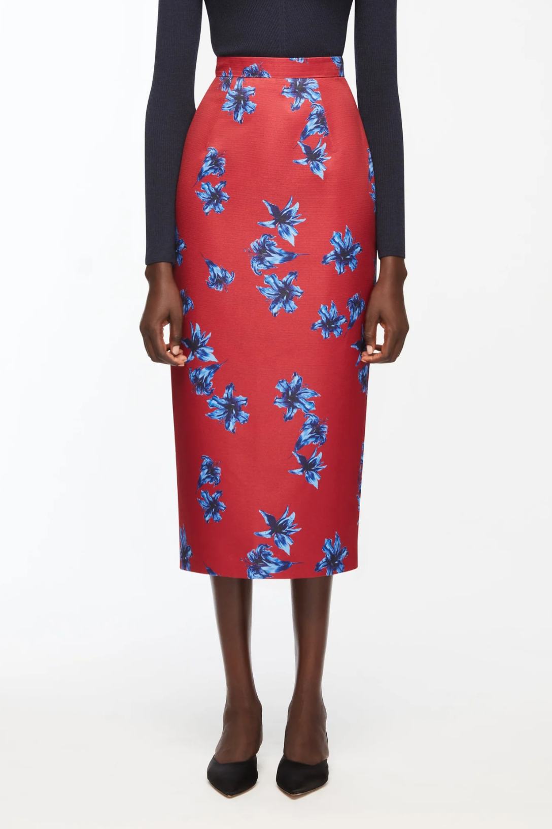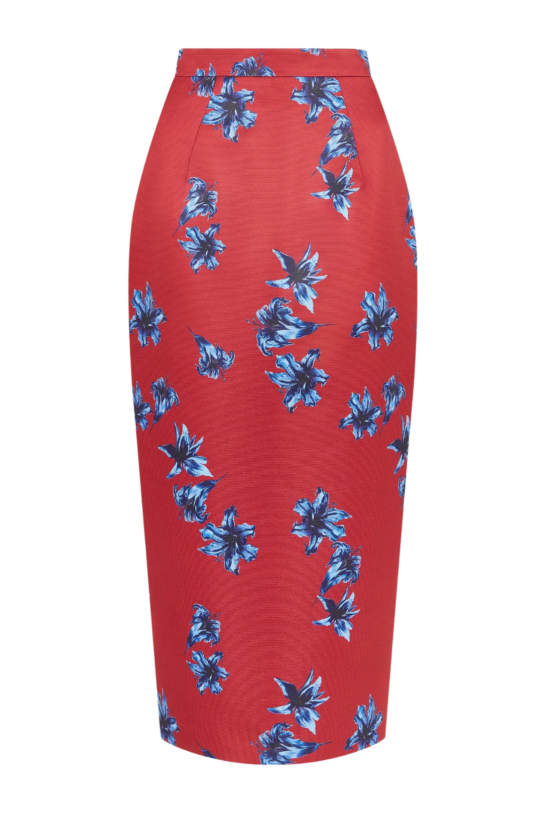 The Lorelei Skirt in red and blue Festive Lillies Taffeta Faille captures a sense of timeless elegance with a vivid, sophisticated twist. Crafted from structured taffeta faille, it features a sculpted pencil silhouette that flatters the figure while maintaining its form with subtle precision. The bold floral motif adds an expressive touch, offering a refined balance between classic tailoring and modern femininity. Perfect for pairing with the coordinating top or a crisp silk blouse for elegant evening occasions.