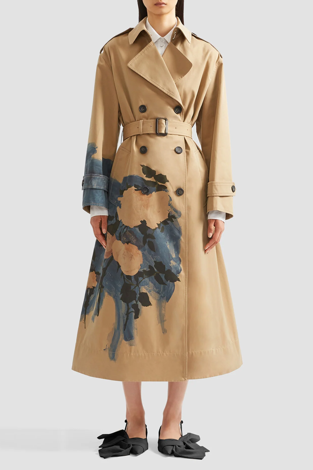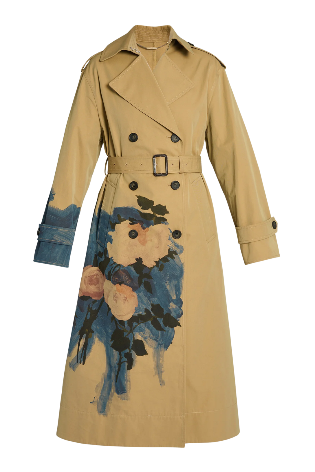 This classic camel trench coat is overprinted with a painted rose design with cobalt blue brushstrokes. It has tabs at the shoulders and cuffs, as well as a buckle-fastening belt.