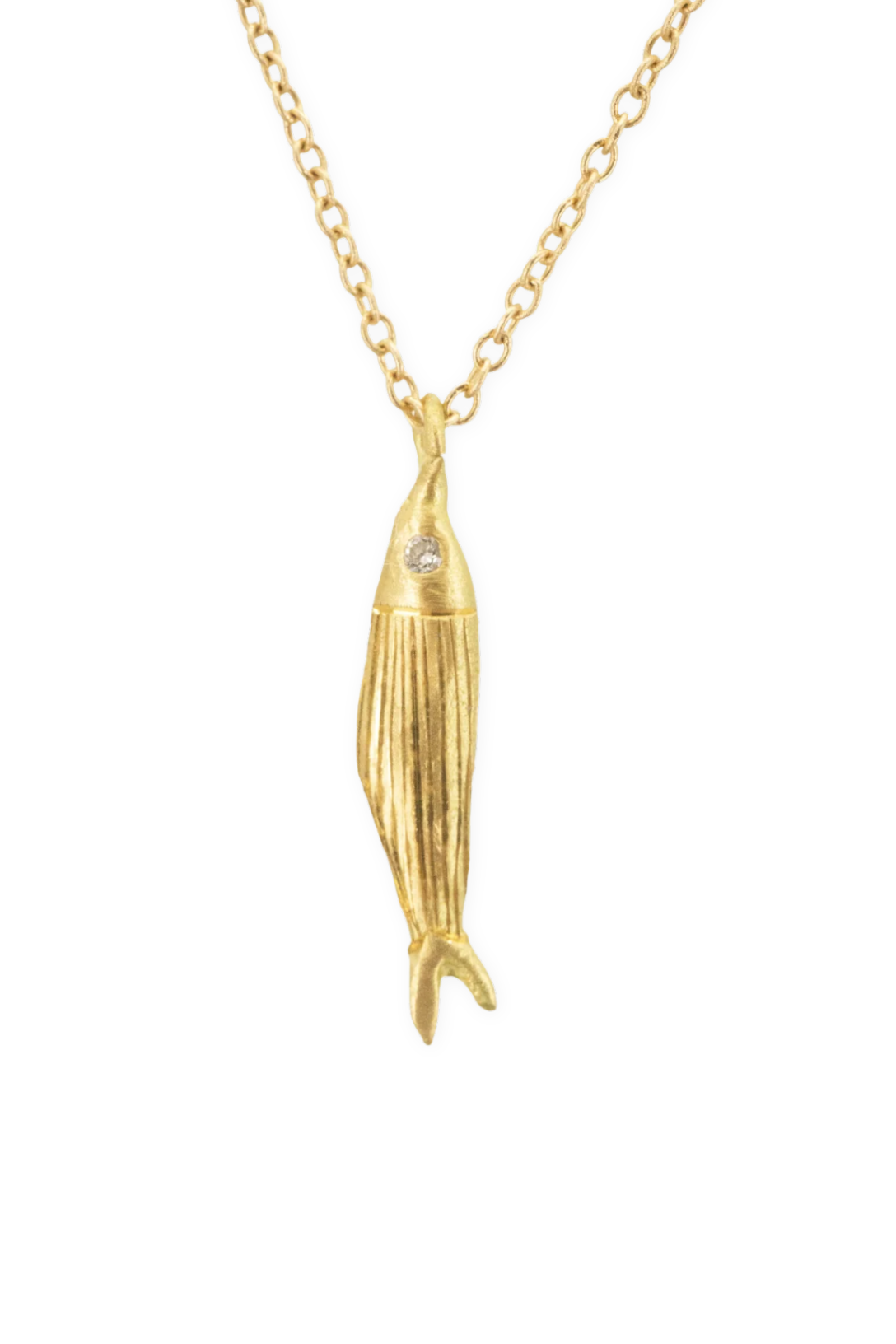 A playful, hand-engraved 18K Yellow Gold fish-shaped pendant with a diamond eye.