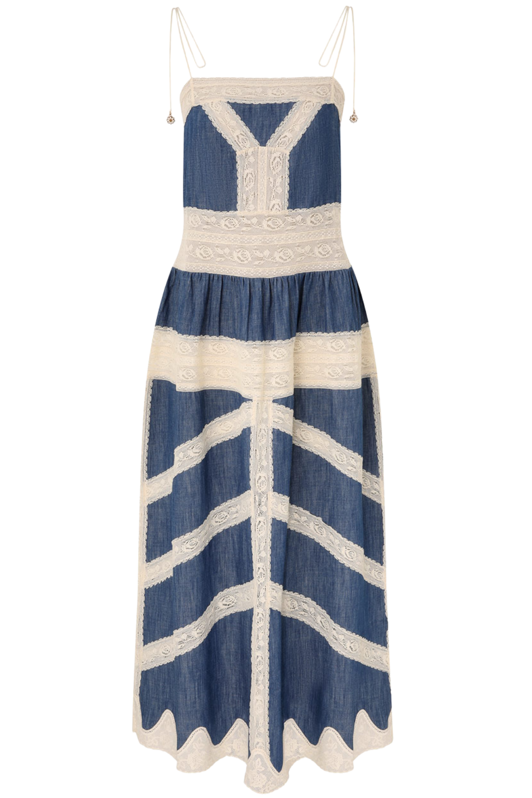 The Awaken Denim Slip Dress in Railway Blue from Zimmermann's Resort Swim 2026 Collection. A denim maxi dress featuring a square neckline, self-tie straps, finished with an invisible center back zip closure and spliced lace detailing throughout.
