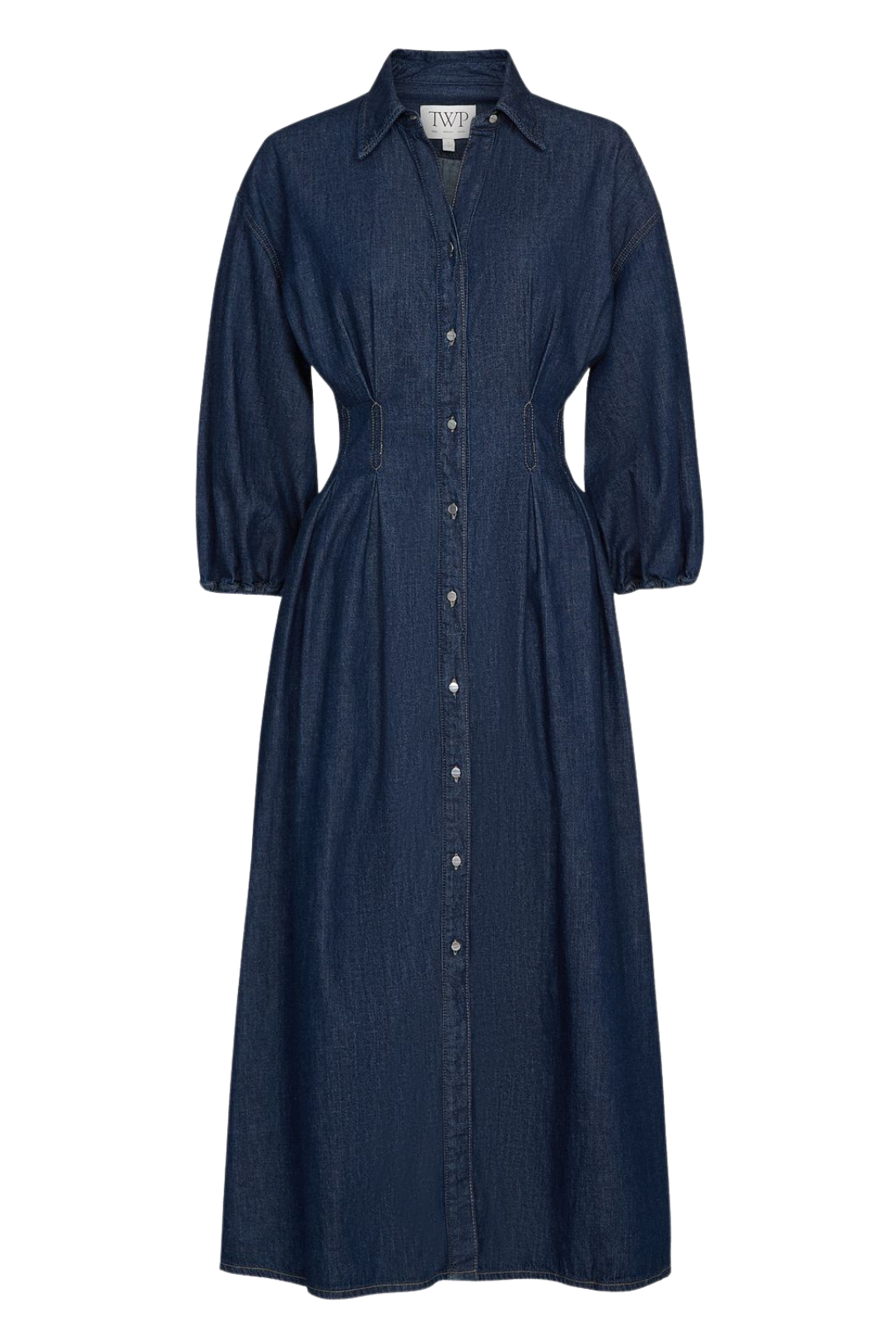 Long-sleeve shirtdress in denim shirting. The Mason Dress has a fitted bodice with contour seaming that releases into a full, midi-length skirt. Finished with a button-front placket, side seam pockets, and volume at the sleeves.
